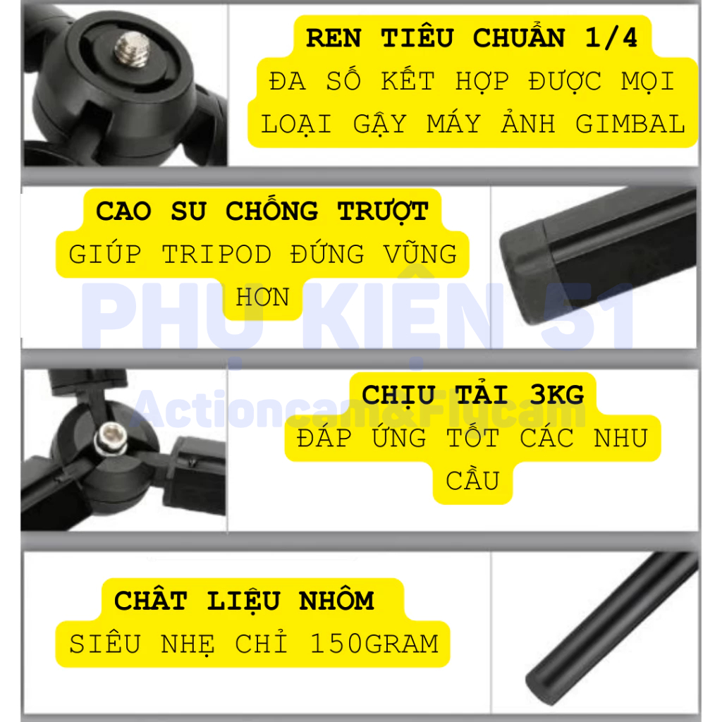 Chân đế tripod gấp gọn hợp kim nhôm có ốc 1/4'' cho máy ảnh Gimbal chịu tải 3kg