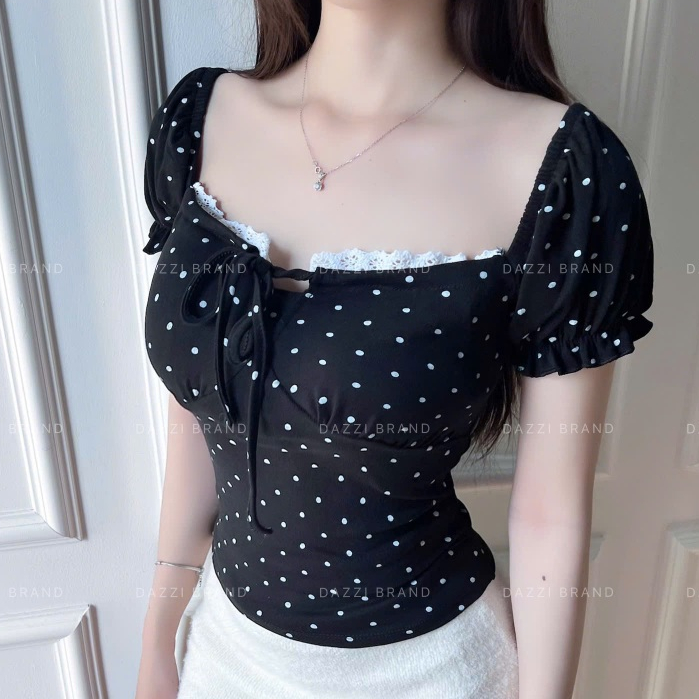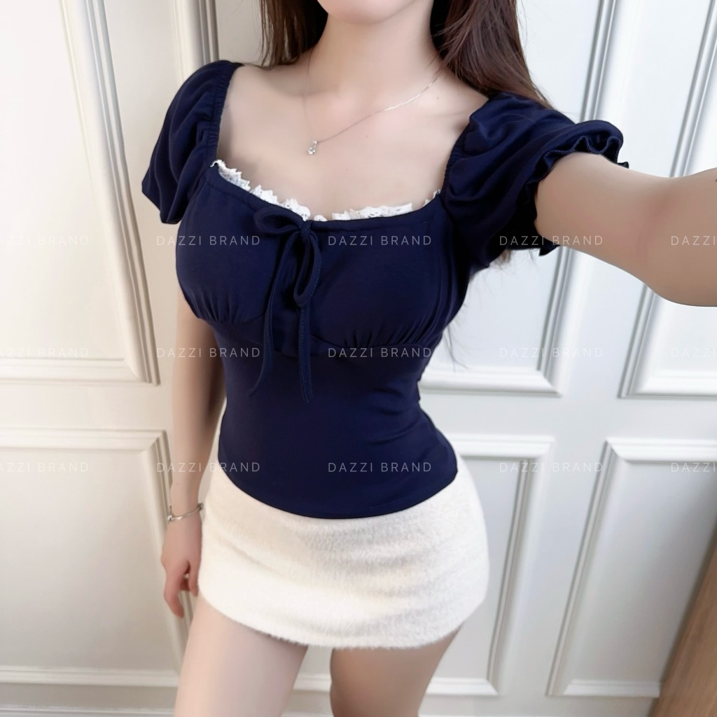 Áo thun nữ cổ vuông phối ren thắt nơ tay phồng xinh xắn vải Cotton mịn DAZZI Women A052