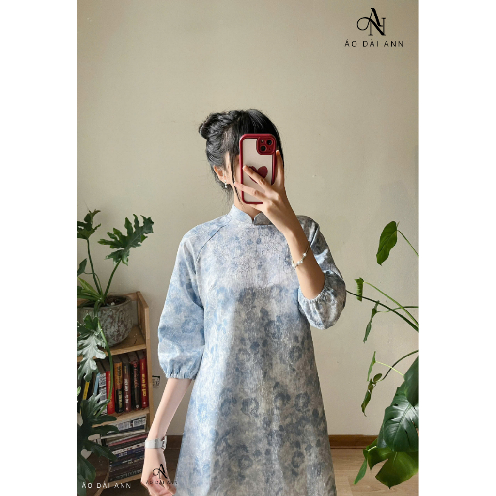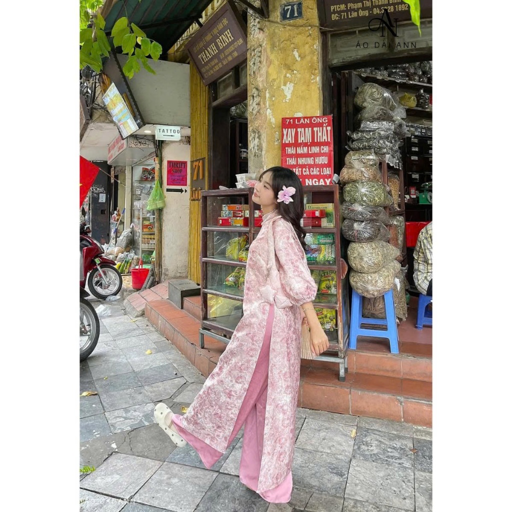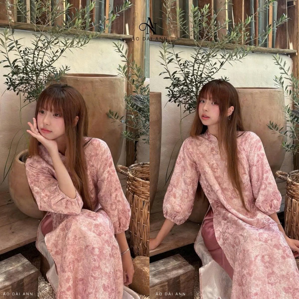 ANN - Áo Dài Hồng Giao Dáng Suông Tay Bo Chun, Chất Vải Gấm Hoa Tông Màu Sang Trọng