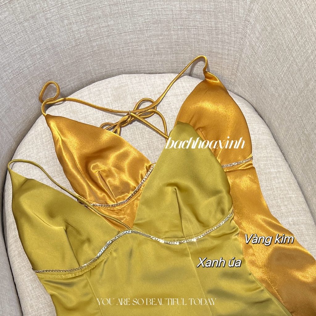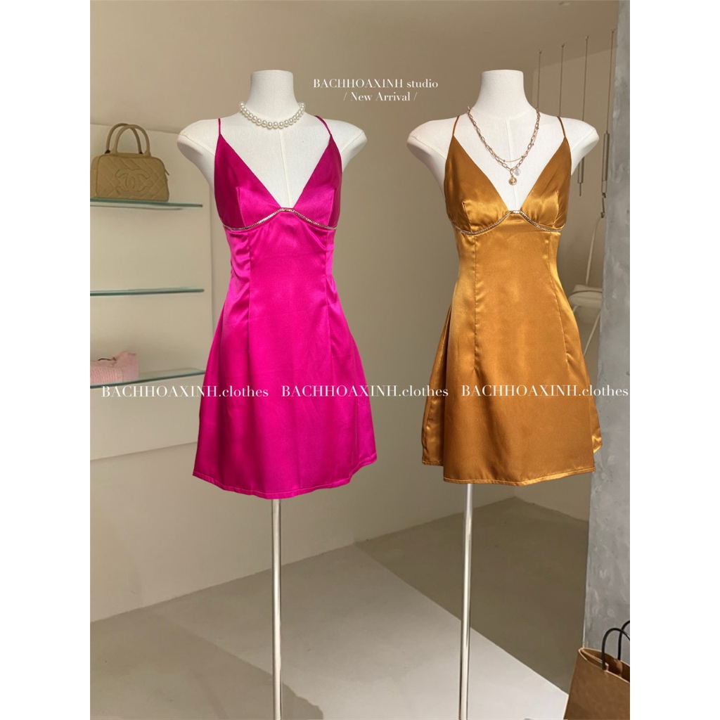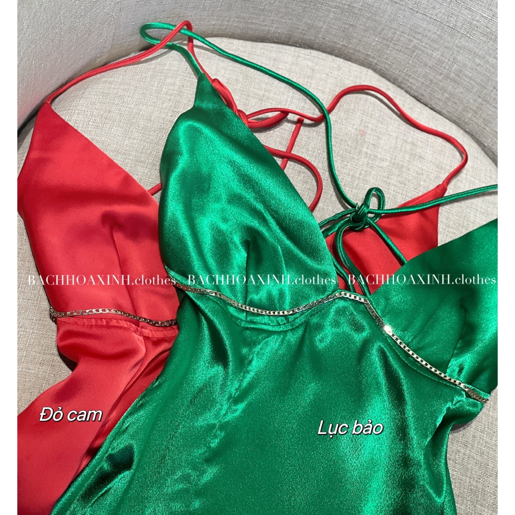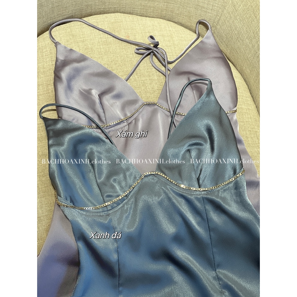 DÁNG NGẮN | Váy lụa 2 dây KIM LOẠI mix ngực cổ V cột lưng bảng màu nổi trendy