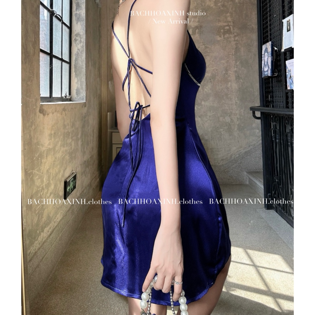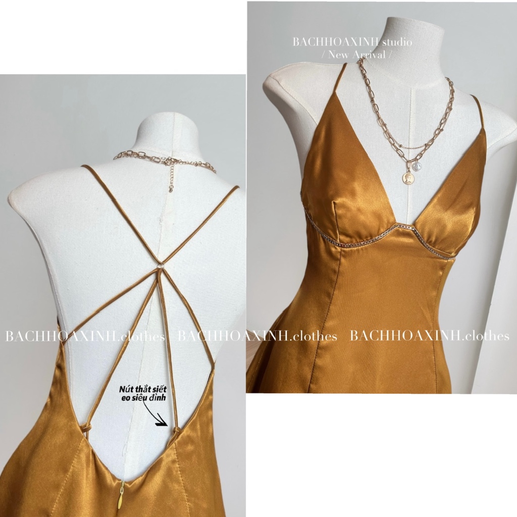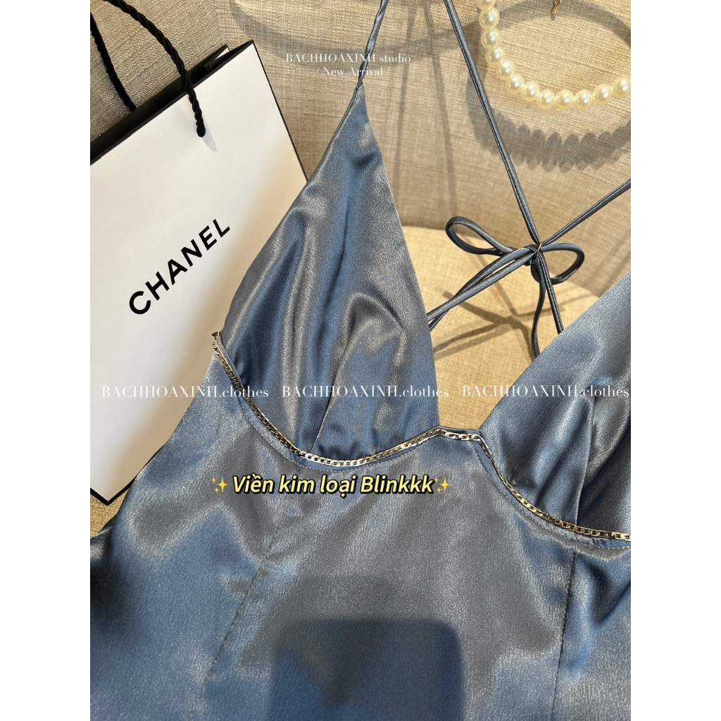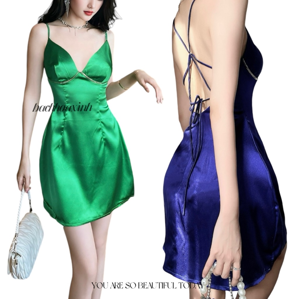 DÁNG NGẮN | Váy lụa 2 dây KIM LOẠI mix ngực cổ V cột lưng bảng màu nổi trendy