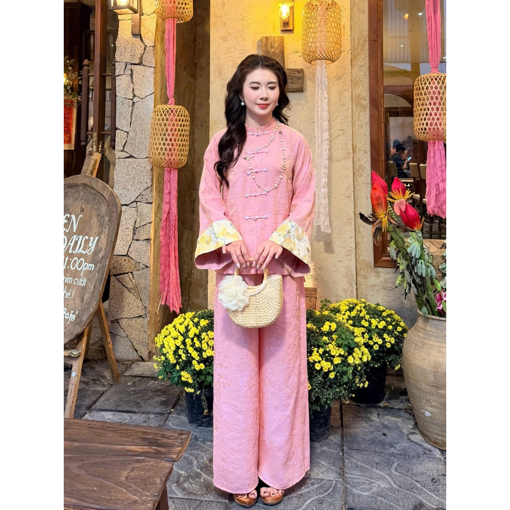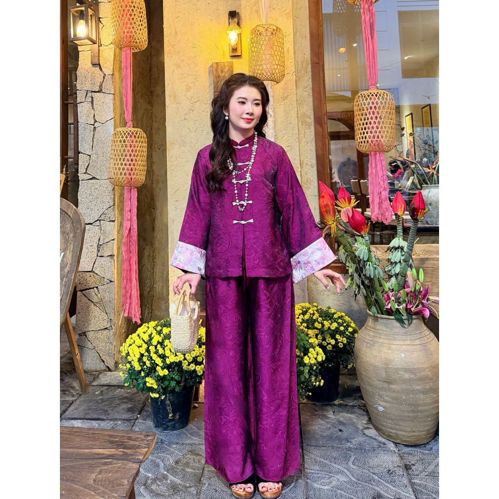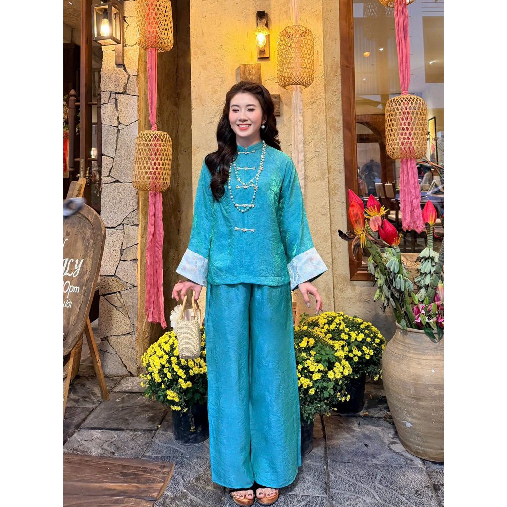 Linh Đan9 - Bộ đồ đi chùa dành cho nữ , hàng thiết kế chất liệu tằm Ánh Kim from xuông nhẹ nhàng cúc đá cổ tàu phối tay
