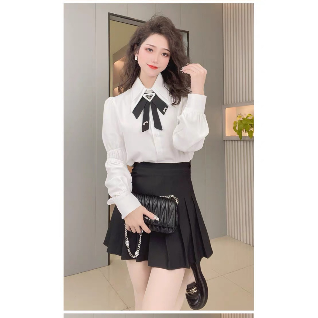 (SALE) Áo sơ mi trắng dài tay vai bồng cách điệu cổ sen kèm nơ tiểu thư thanh lịch thu đông hàn quốc SM12