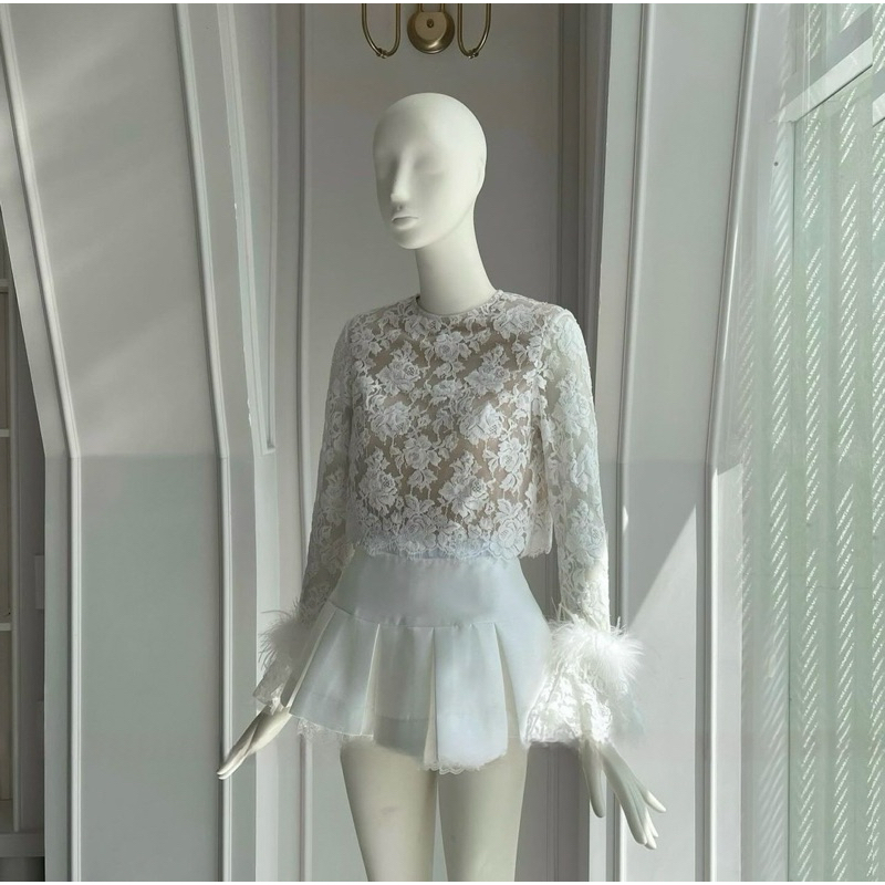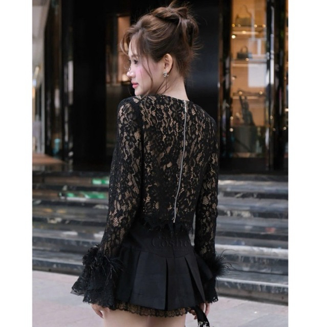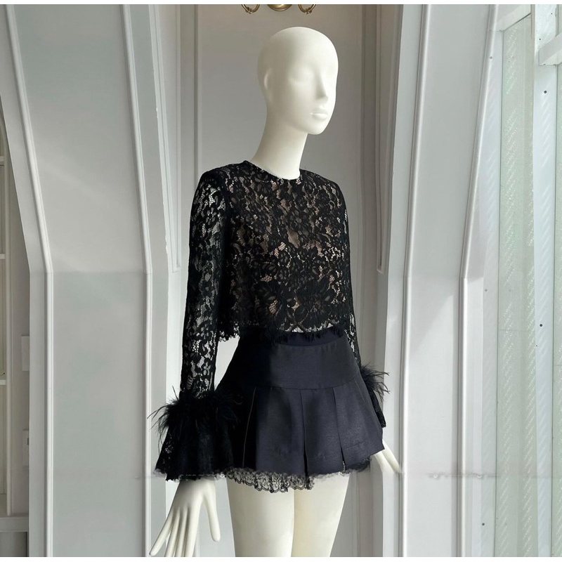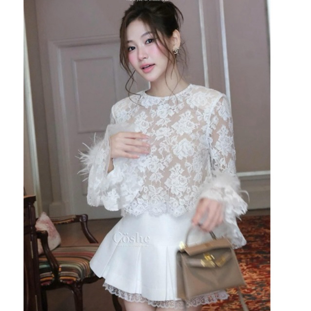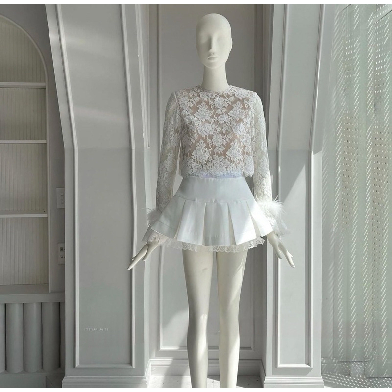 JENNYCLOSET ® “Claire Set”• Áo cổ tròn ren hoa đính lông tay cao cấp mix chân váy xếp ly phối ren ( hàng chuẩn mẫu 100%)