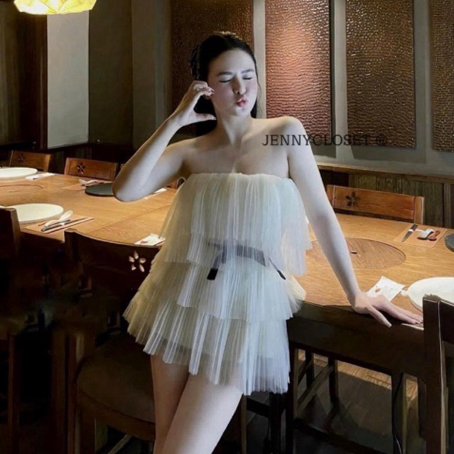 JENNYCLOSET ®”Bitsy Dress” Váy quây dập ly voan dáng ngắn tiểu thư, Đầm nữ cup ngực đính nơ eo hàng TK