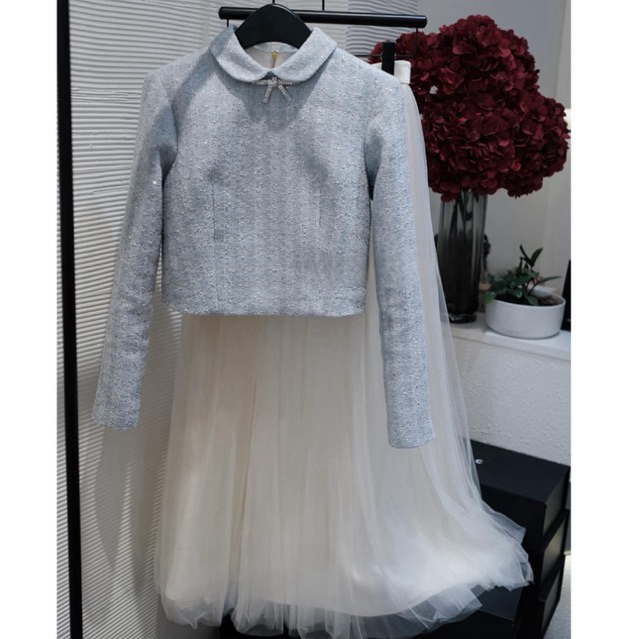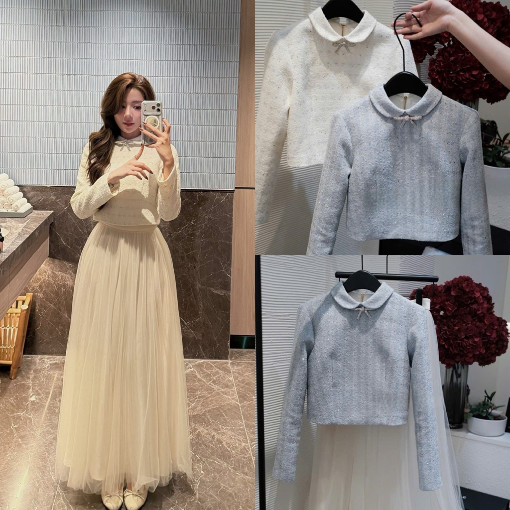 𝗝𝗘𝗡𝗡𝗬𝗖𝗟𝗢𝗦𝗘𝗧 ® Set 2món : Áo dạ tweed bling cổ sen đính nơ dáng crotop +Chân váy lưới dáng dài -2màu :kem,xanh