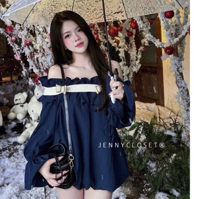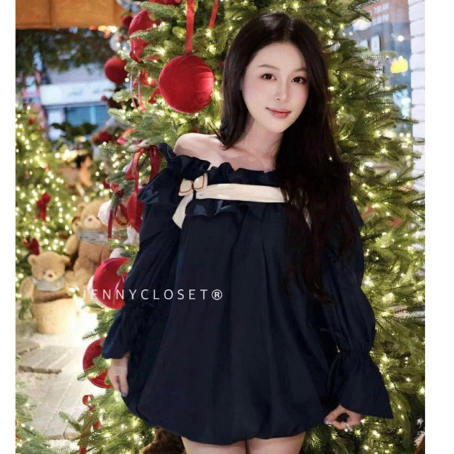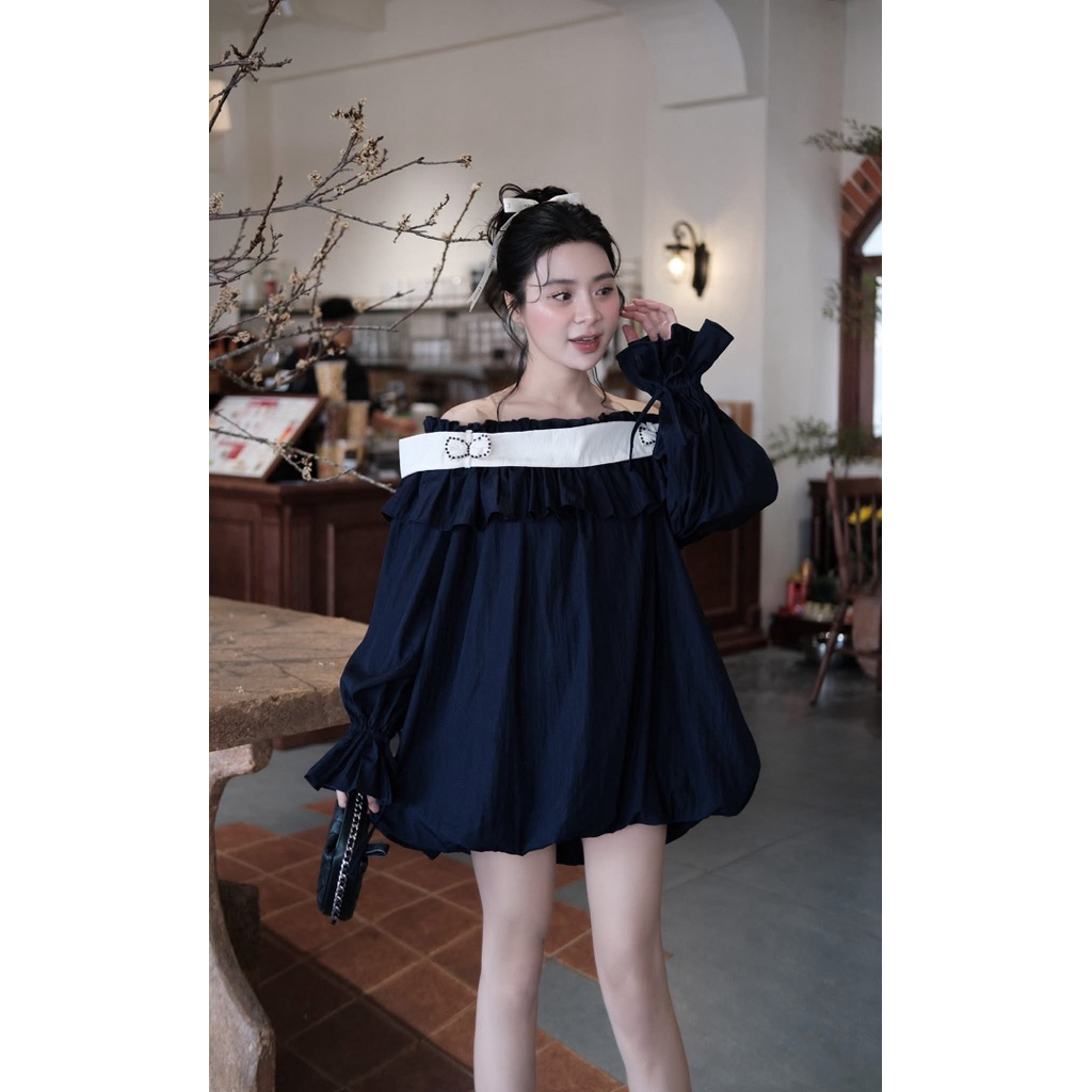 𝗝𝗘𝗡𝗡𝗬𝗖𝗟𝗢𝗦𝗘𝗧 ® Áo váy trễ vai bèo dài tay đính nơ viền đá from bí che khuyết điểm-3màu sang chảnh tiểu thư (hàng L1)