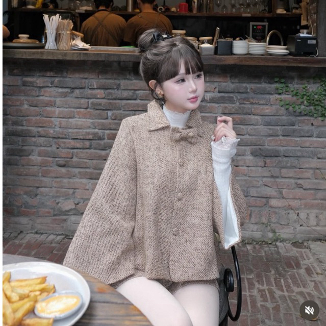 𝗝𝗘𝗡𝗡𝗬𝗖𝗟𝗢𝗦𝗘𝗧 ® Set dạ tweed 2món: Áo khoác dạ cổ đức tay lửng xoè đính nơ + Quần short ngắn style Hàn Quốc-màu nâu sữa