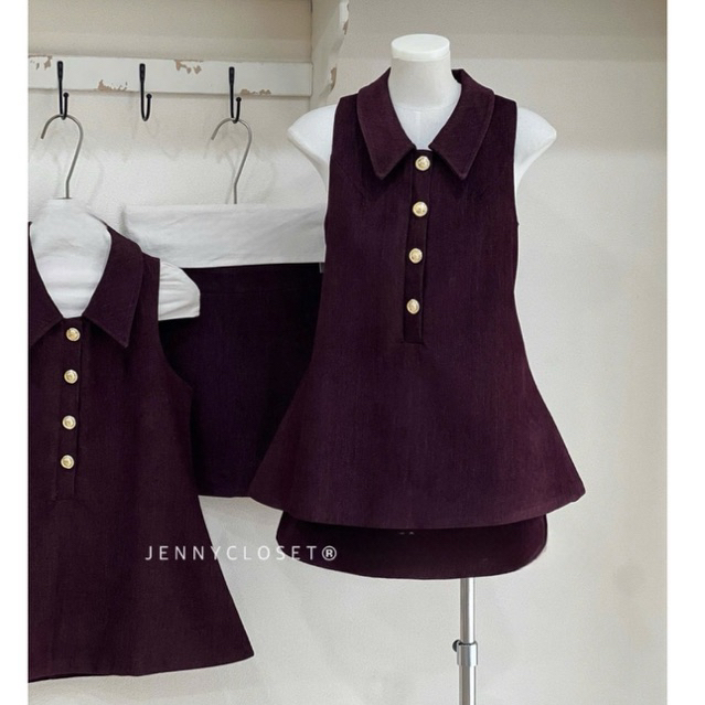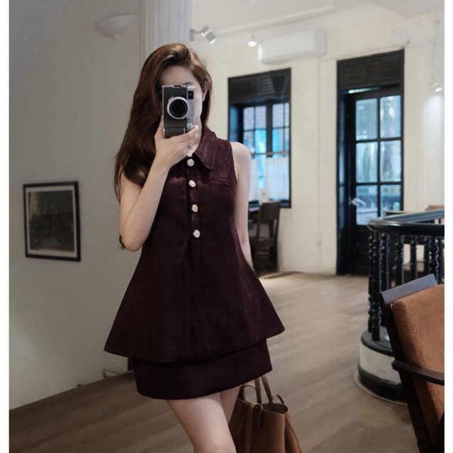 “ 𝗟𝗔𝗖𝗬 𝗦𝗘𝗧 ” • Áo gile cổ bẻ sát nách đính khuy dáng xuông +Chân váy chữ A-màu đỏ sang chảnh tiểu thư(hàng L1-chuẩn mẫu)