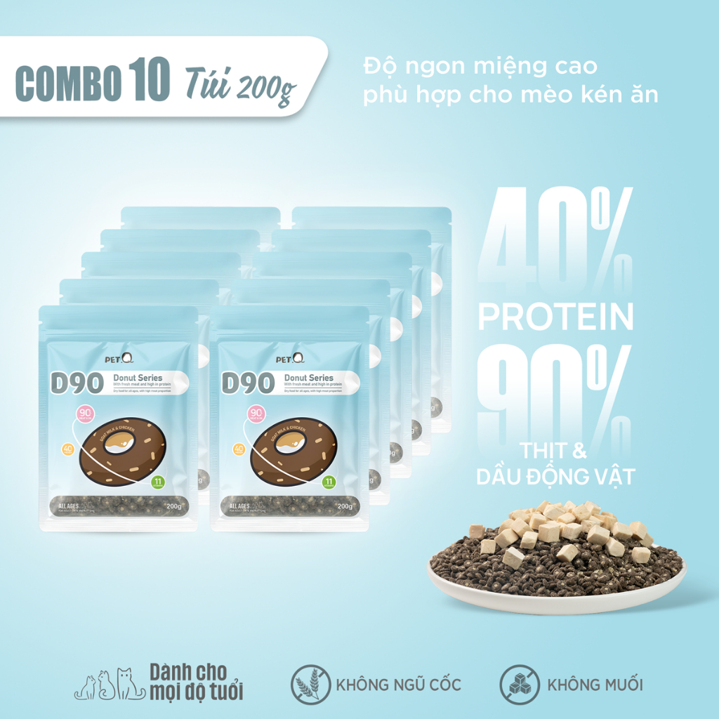 Thức ăn hạt cho mèo PetQ, Hạt Donut D90 PetQ mọi tuổi mèo, Nhân chà bông gà Topping gà sấy, 40% protein, 90% thịt & dầu