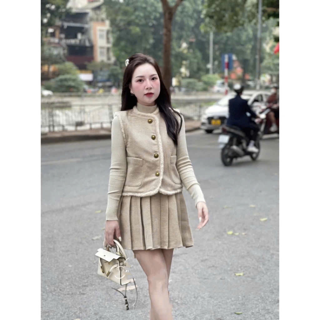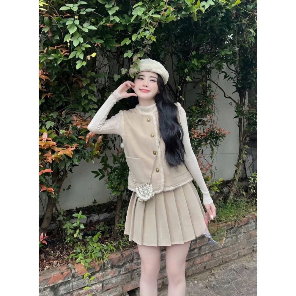 ✔ Set Dạ Gile Phối Lông Viền + áo len ấm Cổ 3cm Mix phần chân váy Dập Ly Màu Siêu Sang