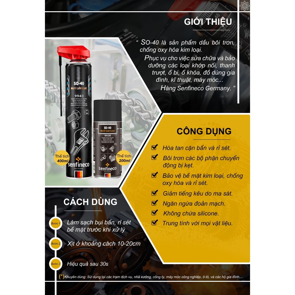 Dầu Mỡ Xịt Bôi Trơn, Làm Sạch và Bảo Vệ Bề Mặt Chi Tiết Senfineco 9939 SO-40 Multi Lubricant 200ML - HSD 5 Năm - KT