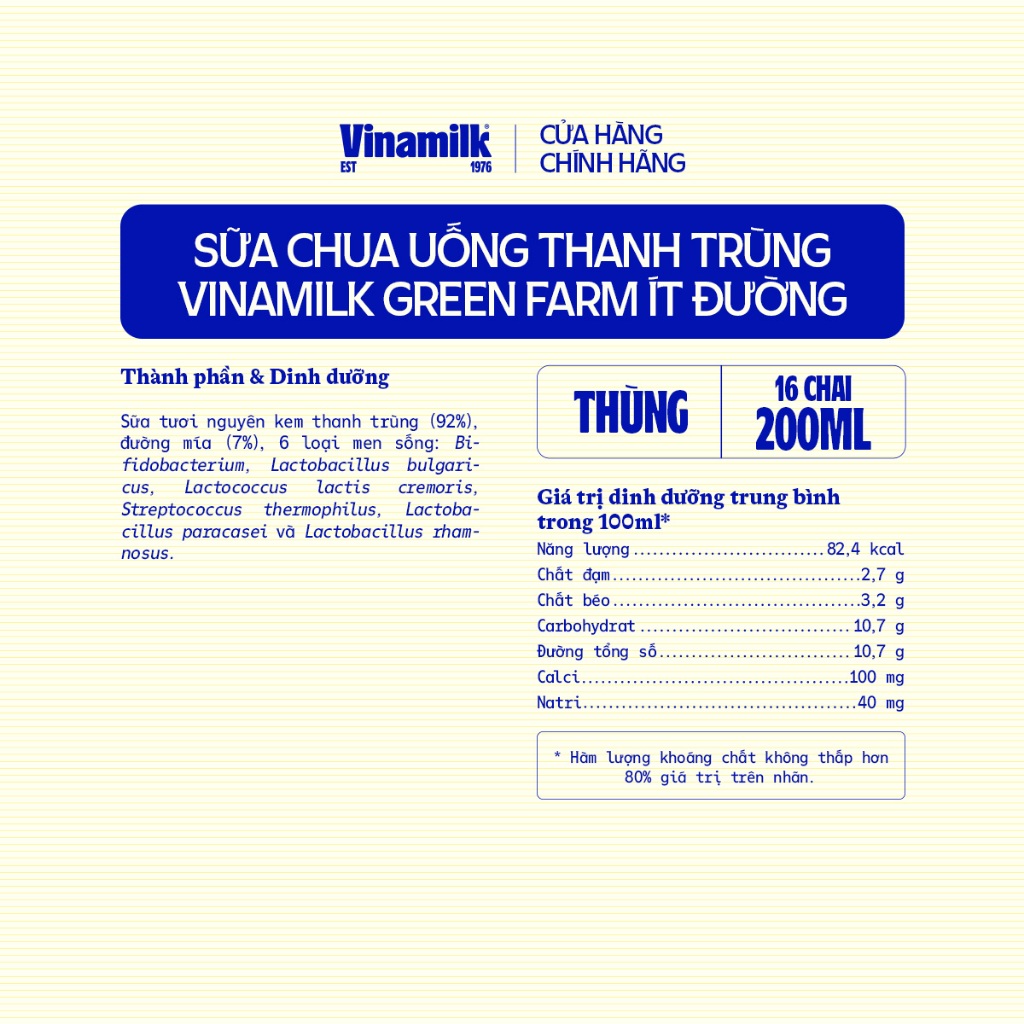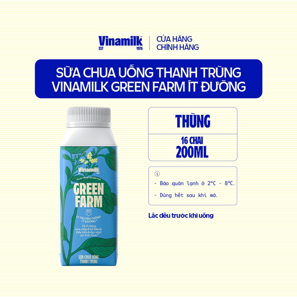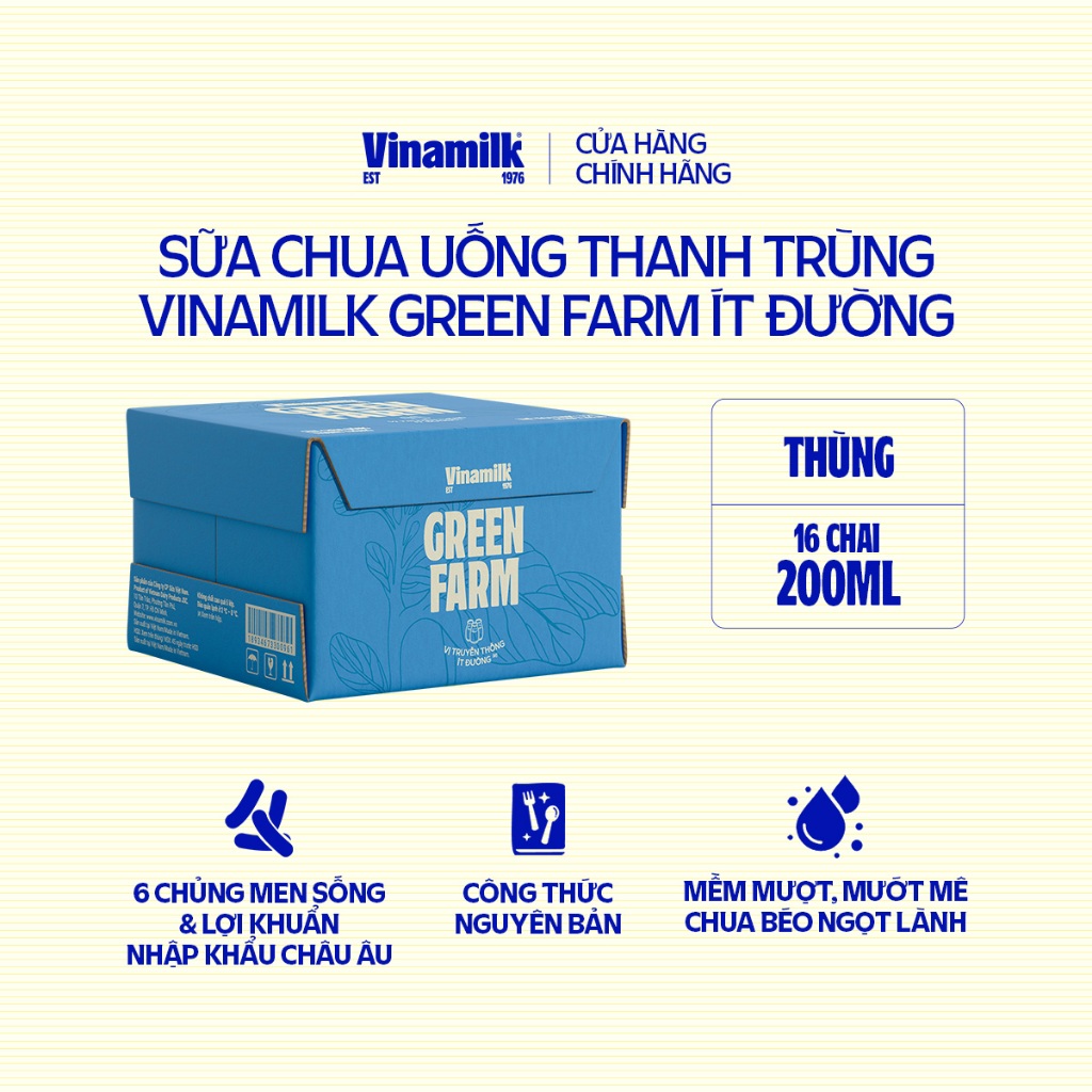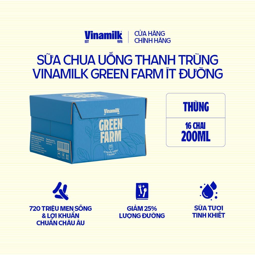 [CHỈ GIAO HCM+HN] Thùng 16 chai sữa chua uống thanh trùng Vinamilk Green Farm Ít đường - chai 200ml