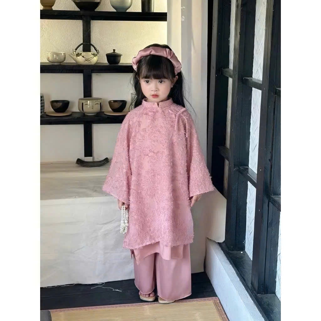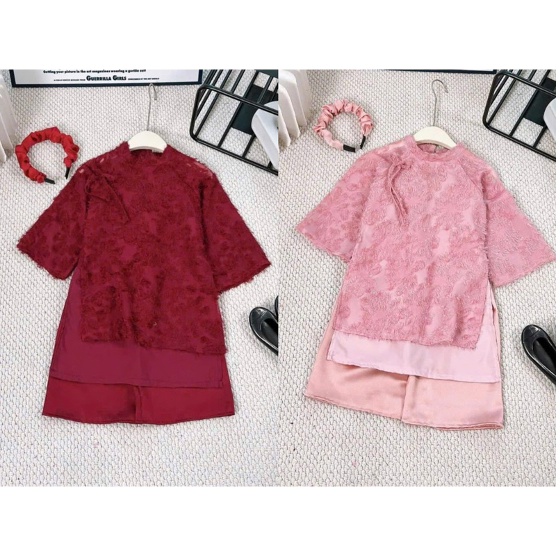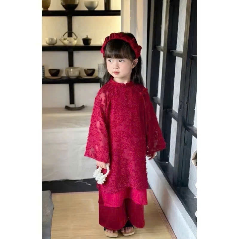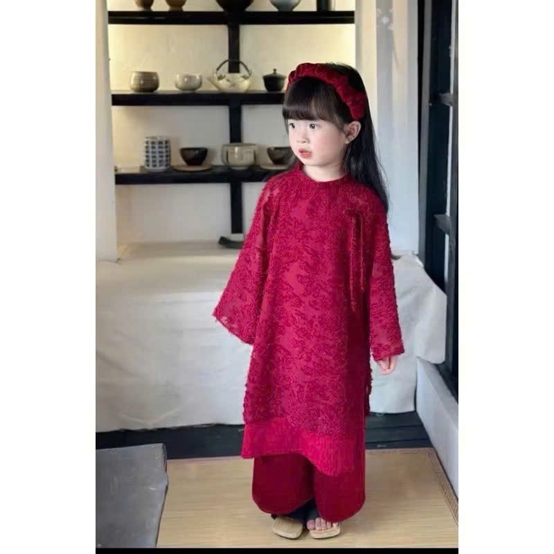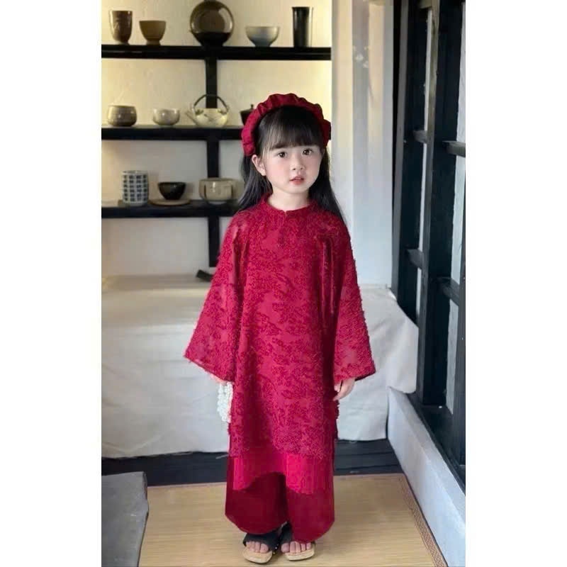 Áo dài đỏ mặc tết cho bé, áo dài cách tân lông vũ bé gái tạng kèm mấn nhún cũng màu xinh yêu cho bé