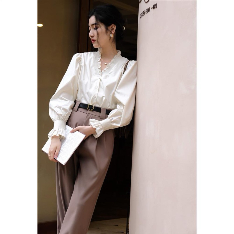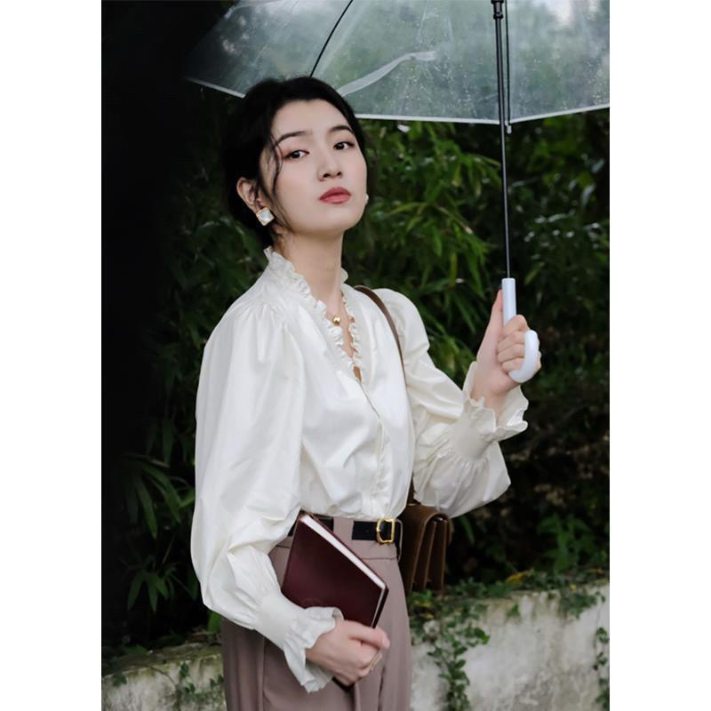 【Ảnh thật shop sẵn】Áo sơ mi nữ màu trắng cổ V CHUN REN ống loe kiểu dáng basic công sở mẫu new