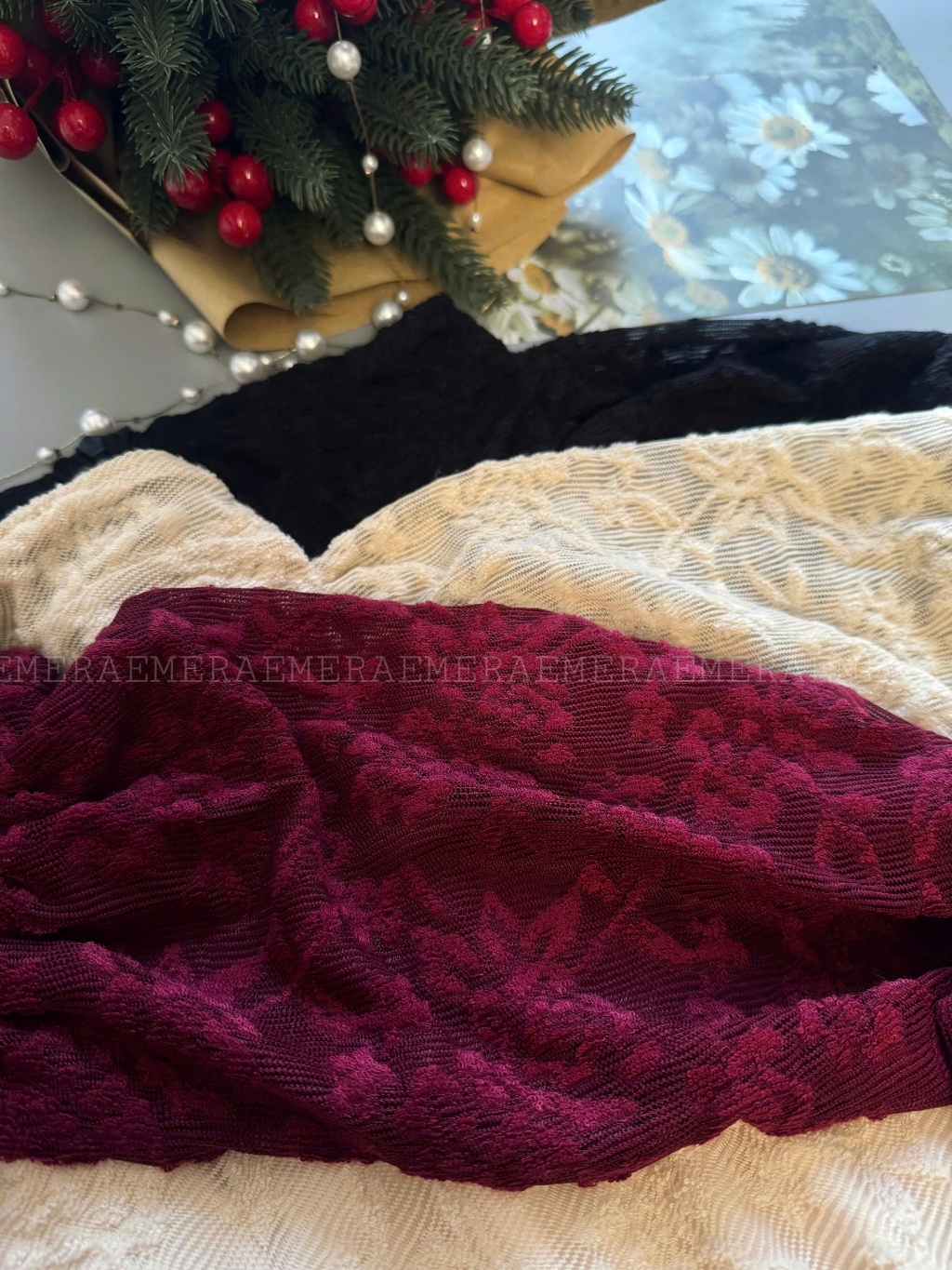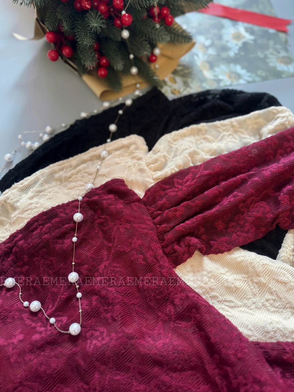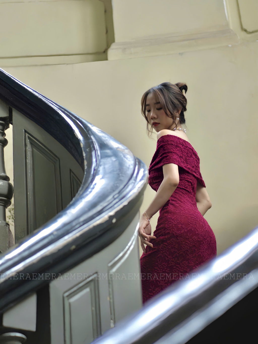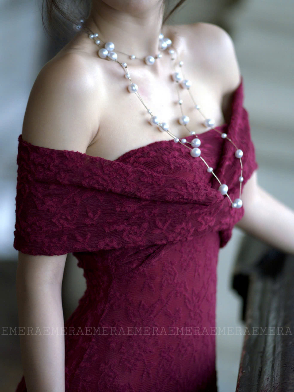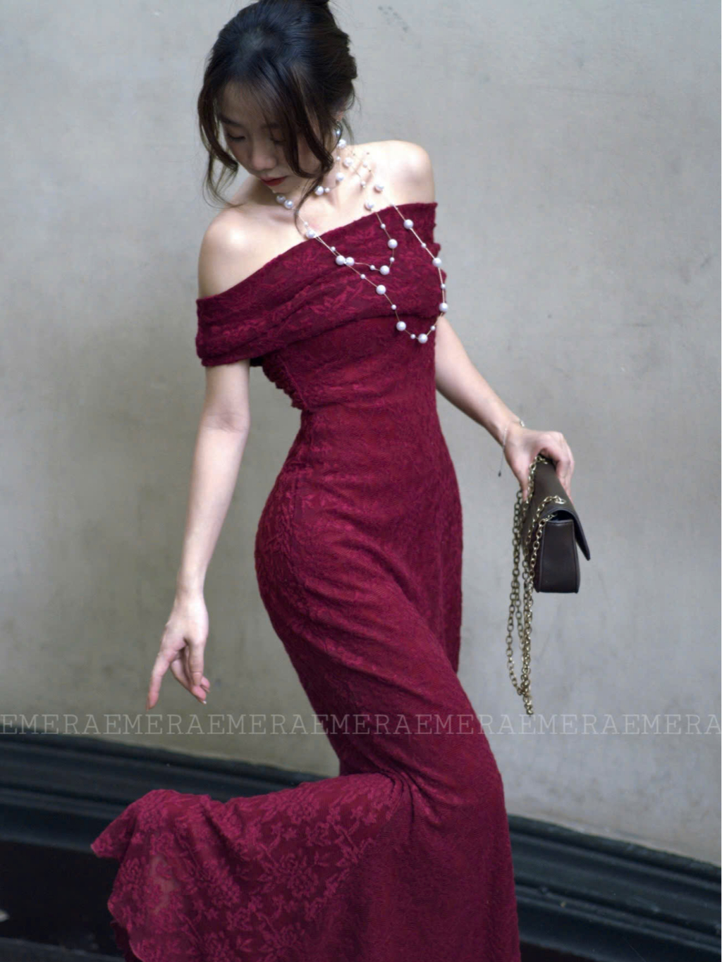 Váy Pearl đỏ đô Váy body 2 lớp chất ren thun cao cấp, dáng dài, trễ vai đuôi cá mặc nhiều kiểu Emera