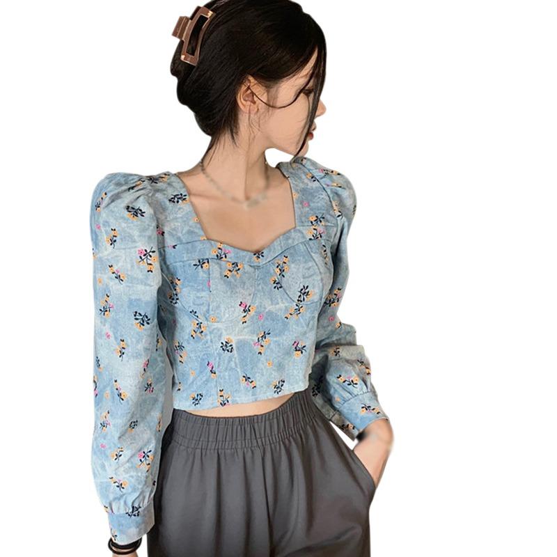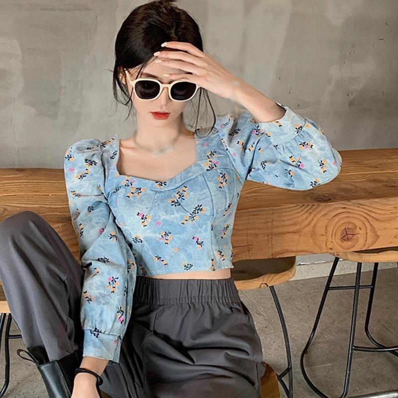 Áo kiểu tay dài cổ vuông họa tiết hoa phong cách retro Hàn Quốc xinh xắn thời trang cho nữ