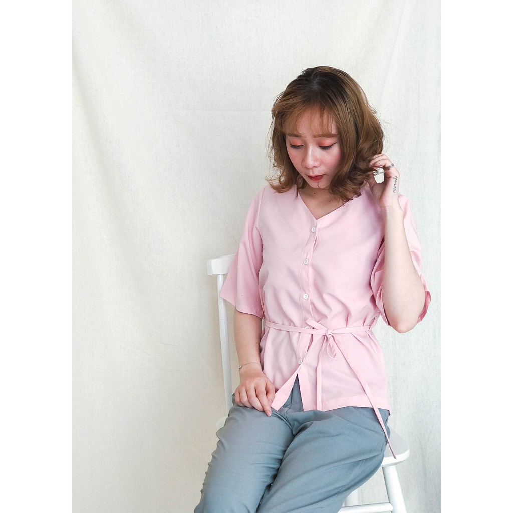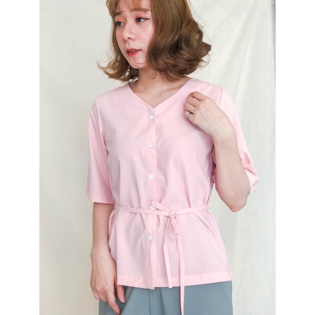 Áo sơ mi nữ tay ngắn cổ V màu hồng pastel, hàng thiết kế A0002