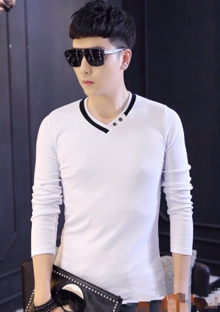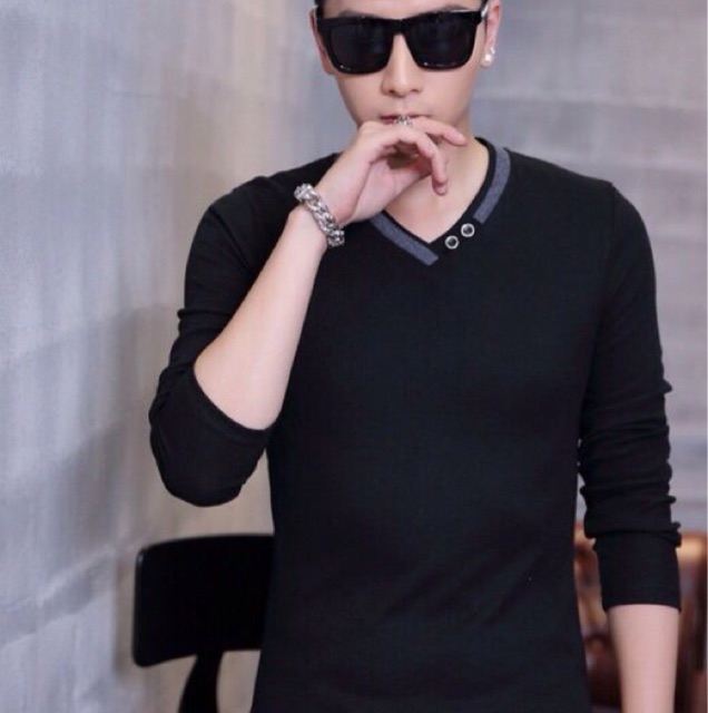 Áo thun nam dài tay thời trang cao cấp cổ tim- đen