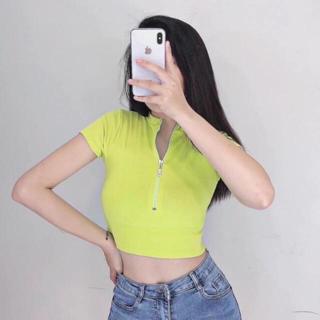 Áo croptop khoá kéo tay ngắn dáng ôm chất thun cotton đẹp , áo thun kiểu nữ dáng croptop ôm body