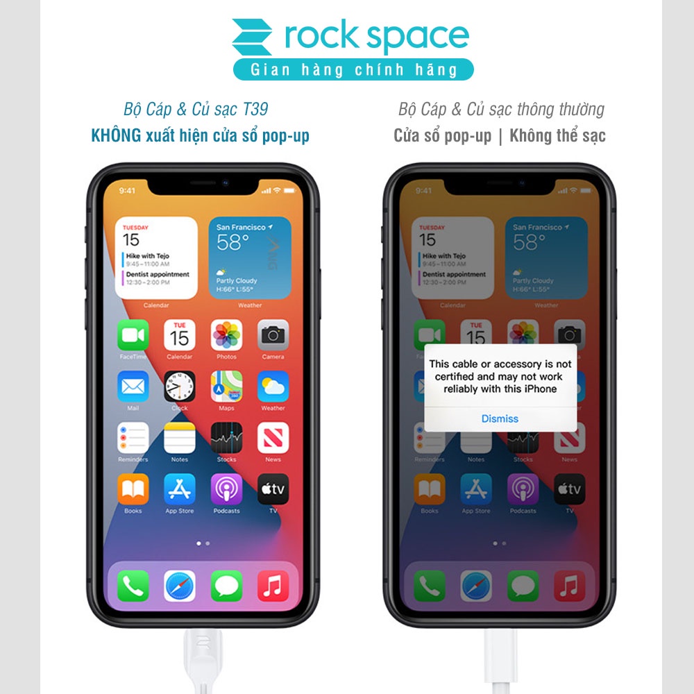 Bộ củ cáp sạc nhanh cho iPhone Rockspace T39 củ sạc 2 cổng 2.4A hàng bảo hành 12 tháng lỗi 1 đổi 1