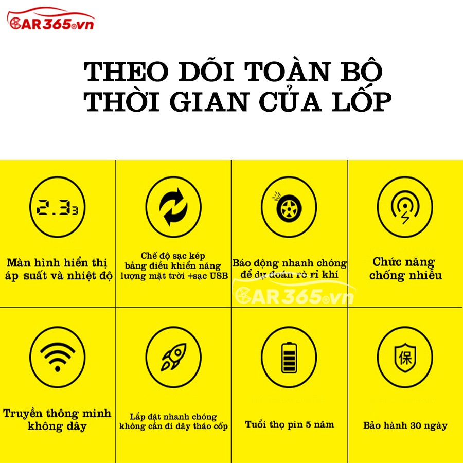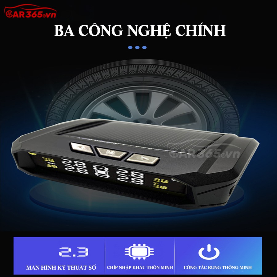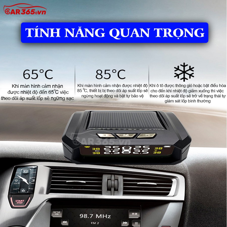 Cảm biến áp suất lốp van ngoài cao cấp thương hiệu CAR365 - Màn LCD hiển thị thông số - Pin năng lương mặt trời - CAR37