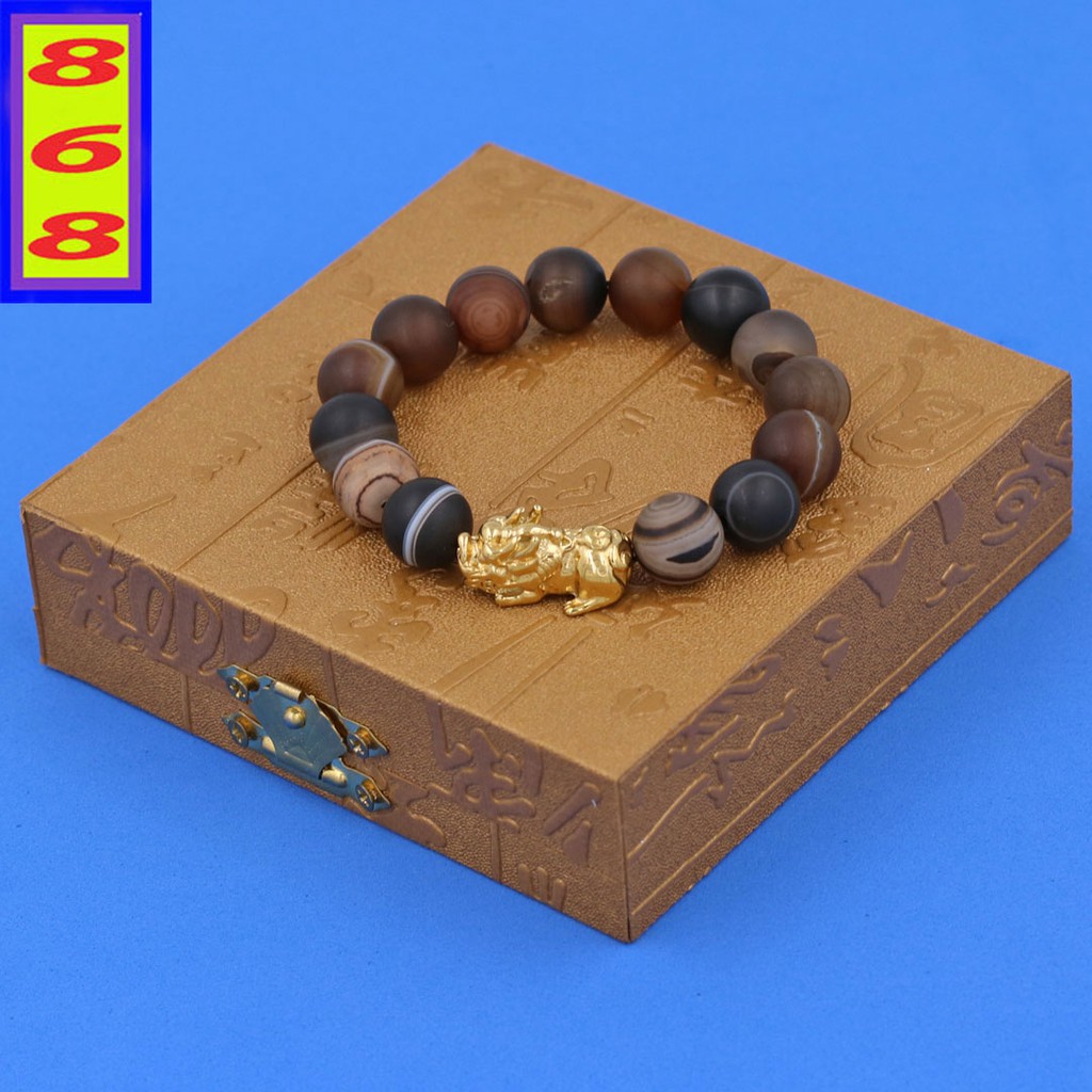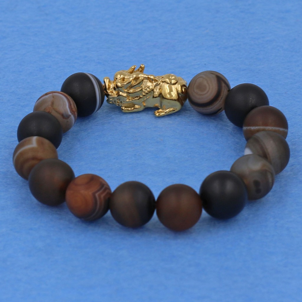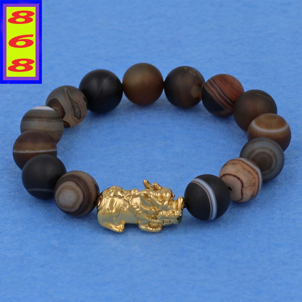 Chuỗi đeo tay mã não Nâu Sọc Mờ 12 ly Tỳ Hưu inox - hợp mệnh Kim, mệnh Thổ, vòng chuỗi đeo tay
