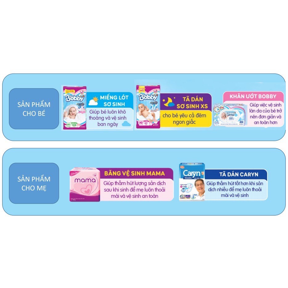 [Combo Mẹ đi sinh] Miếng lót Bobby 1-28,tã dán Bobby XS42, khăn ướt Bobby 100, BVS Mama 12m, tã dán Caryn 3m, túi mẹ bé