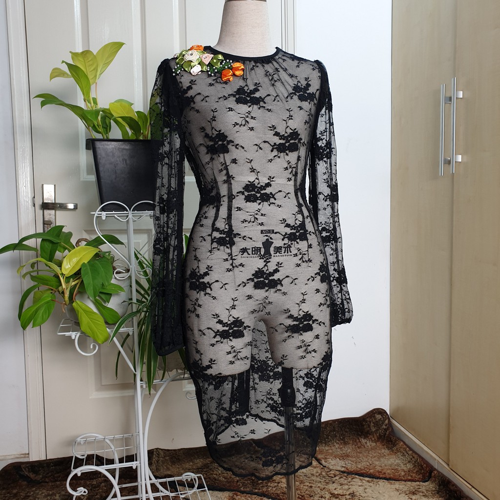 Đầm thiết kế ôm body ren lưới hoa đen đính hoa ruy băng 3D mới 99% HIGH SECOND HAND A94