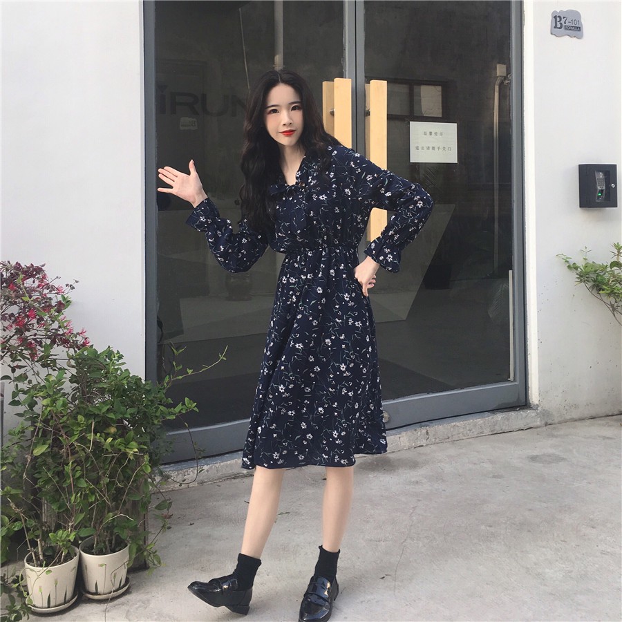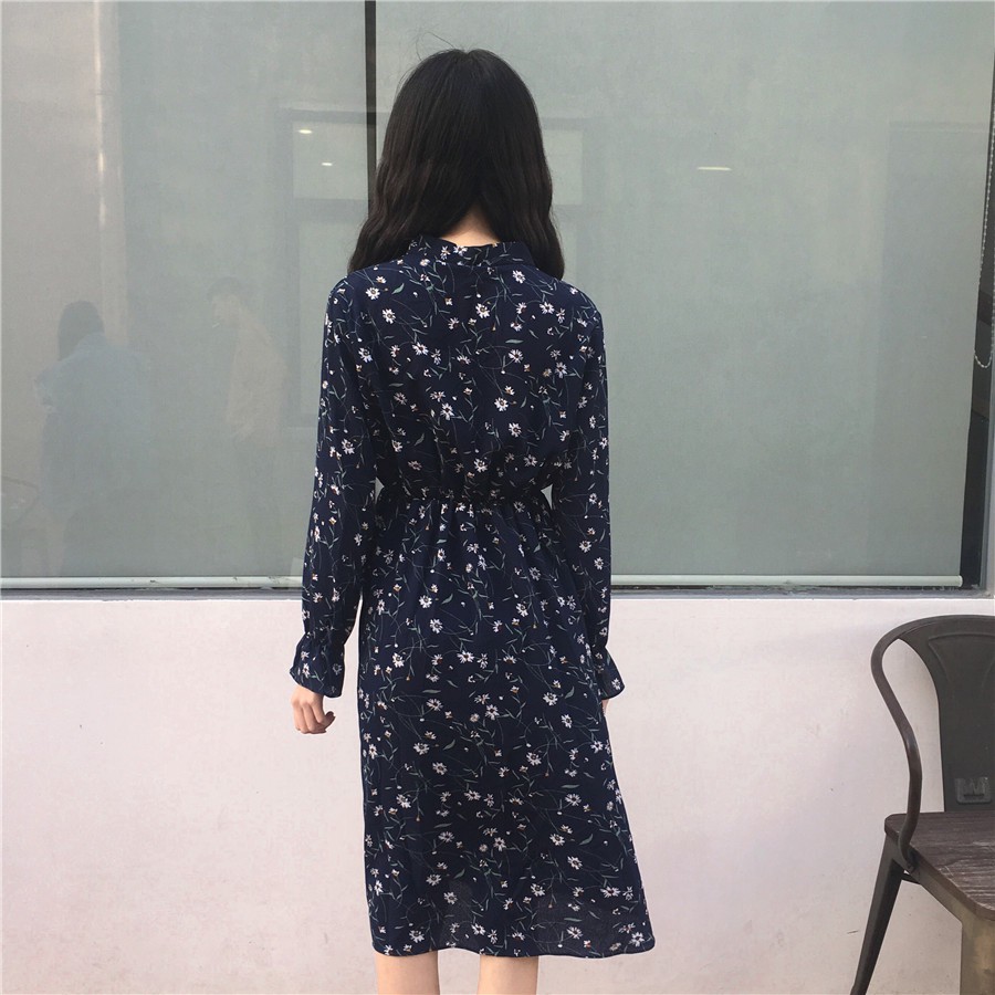 Đầm tiểu thư hoa nhí dài tay nhún eo phù hợp với mùa thu và mùa xuân