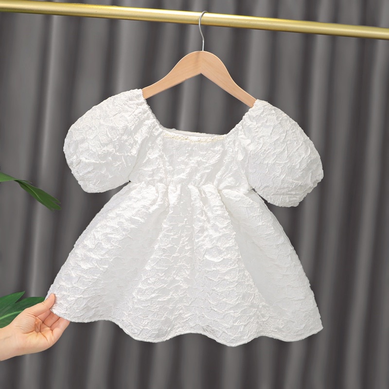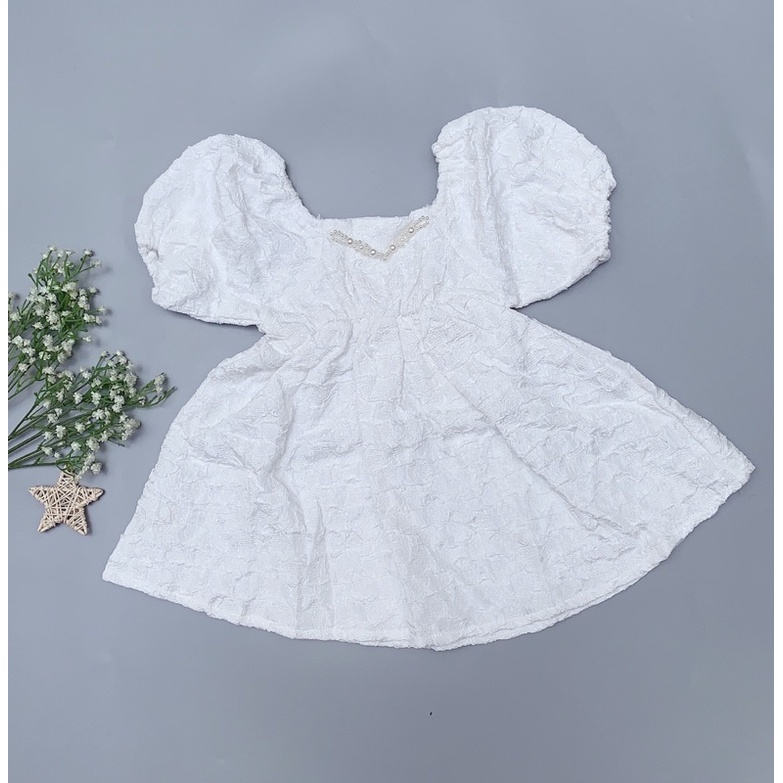 Đầm trắng kate xốp phối dây hạt cườm dễ thương cho bé thôi nôi, 1 tuổi