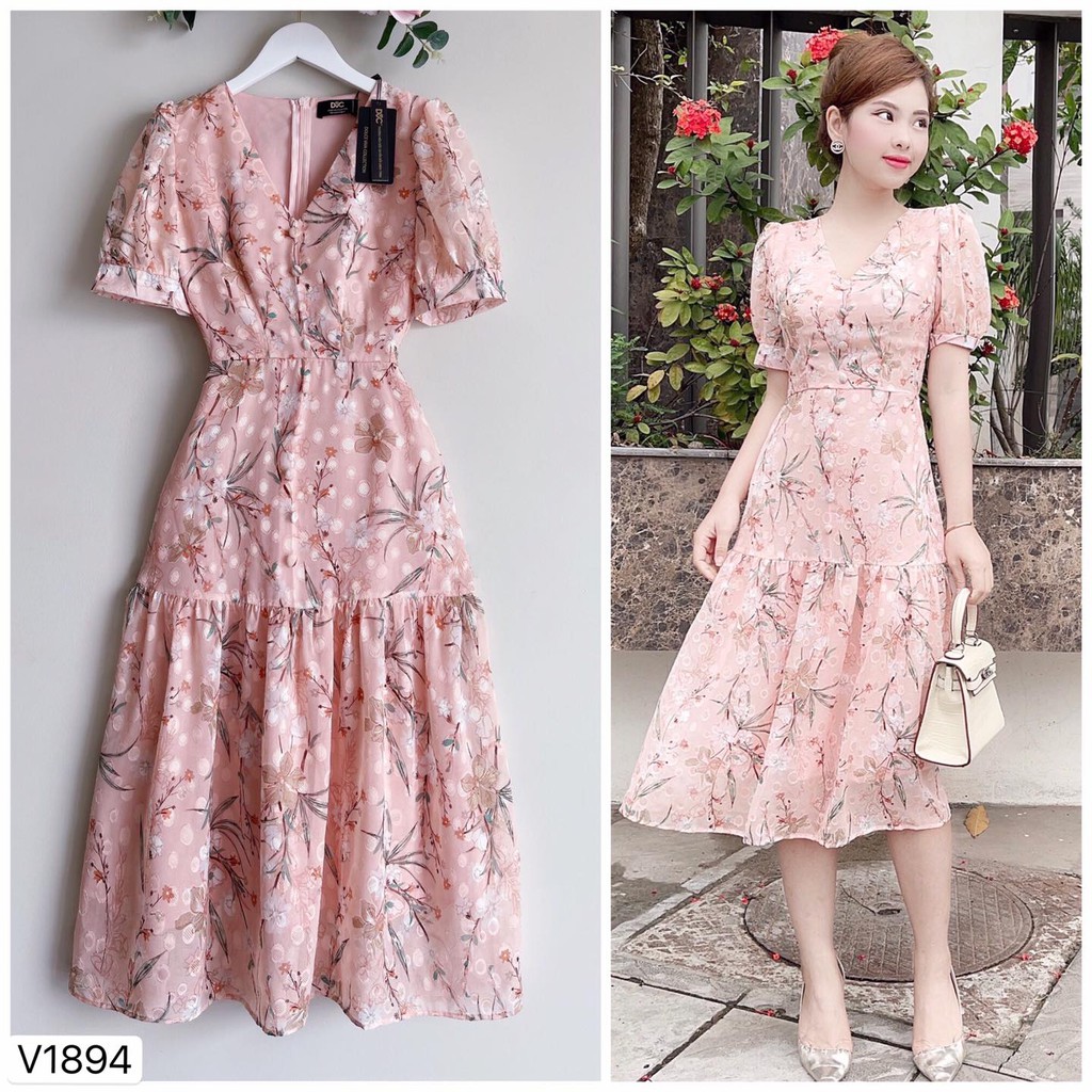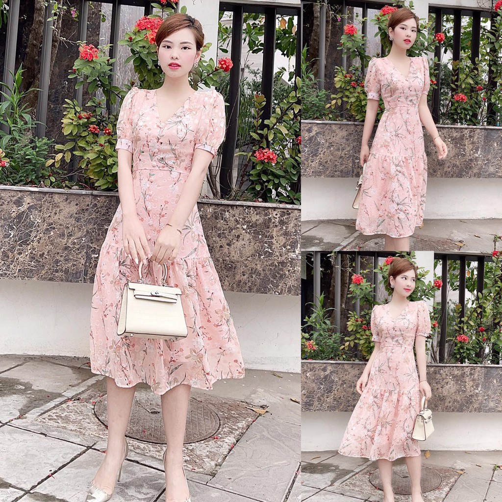 Đầm xòe hoa nhí, đầm hoa nhí dễ thương màu hồng pastel ❤️ Freeship ❤️ tay bồng ngắn, cổ V trẻ trung, dịu dàng nữ tính