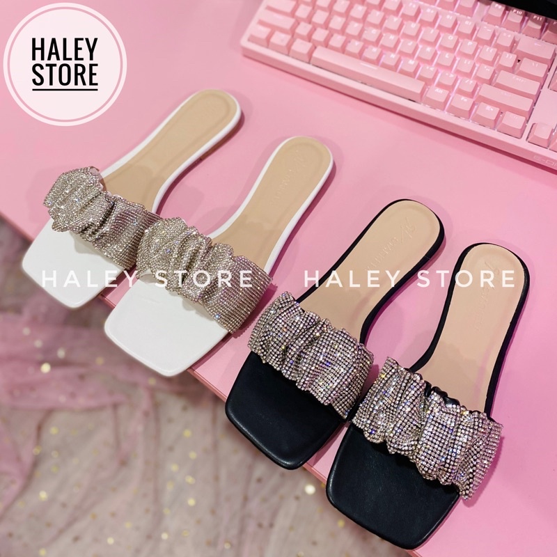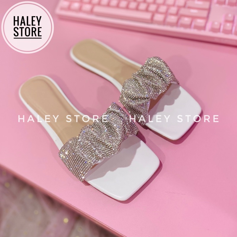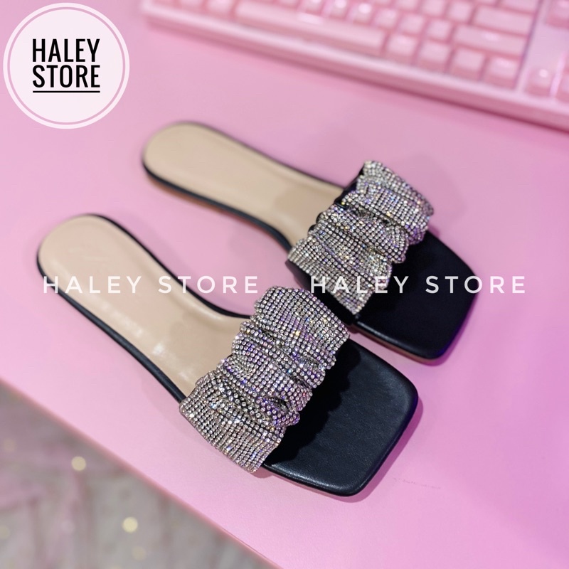 Dép l lê bệt đế bằng nữ mũi vuông quai ngang nhúm đính đá hot mùa hè 2021