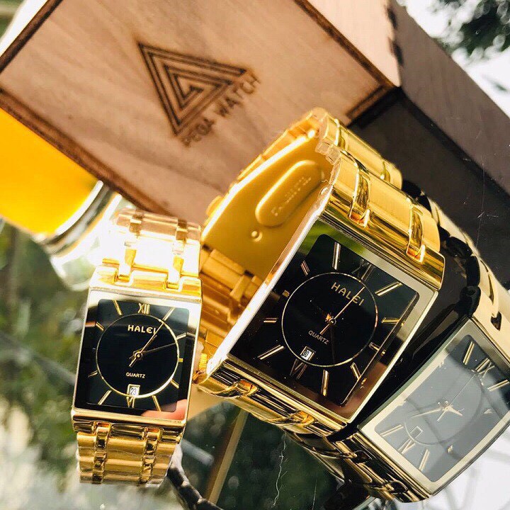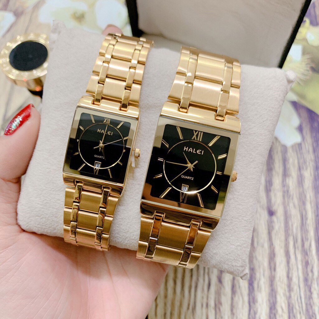 Đồng hồ cặp đôi nam nữ Halei T88 mặt đen vuông dây thép vàng cao cấp phong cách sang trọng quý phái