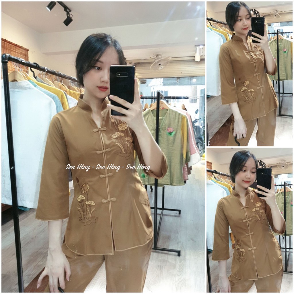 🕉️Quần áo Phật tử áo lam đi chùa Pháp Phục cao cấp mẫu cổ tàu thêu sen hàng loại 1