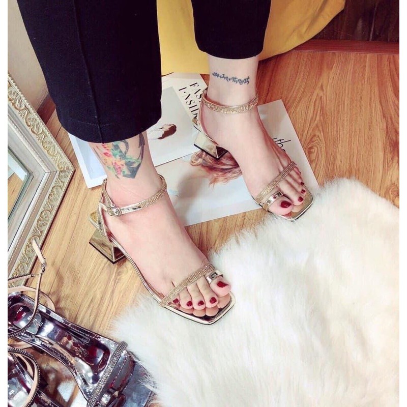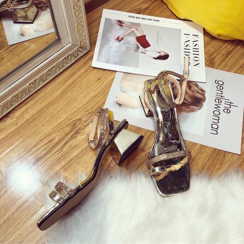 Giày sandal cao gót quai mảnh đính đa xỏ ngón da bóng gót tháp 4p siêu hot