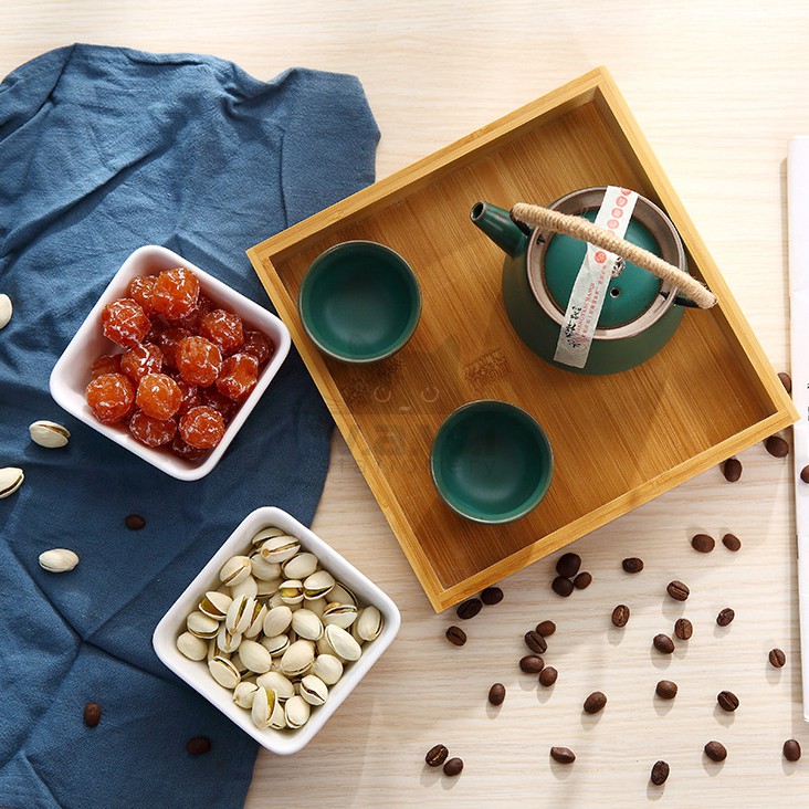 [CHẤT LƯỢNG] Bộ khay thực phẩm gỗ tre có 4 ô sứ dùng chia bánh, mứt, thức ăn dặm, nguyên liệu