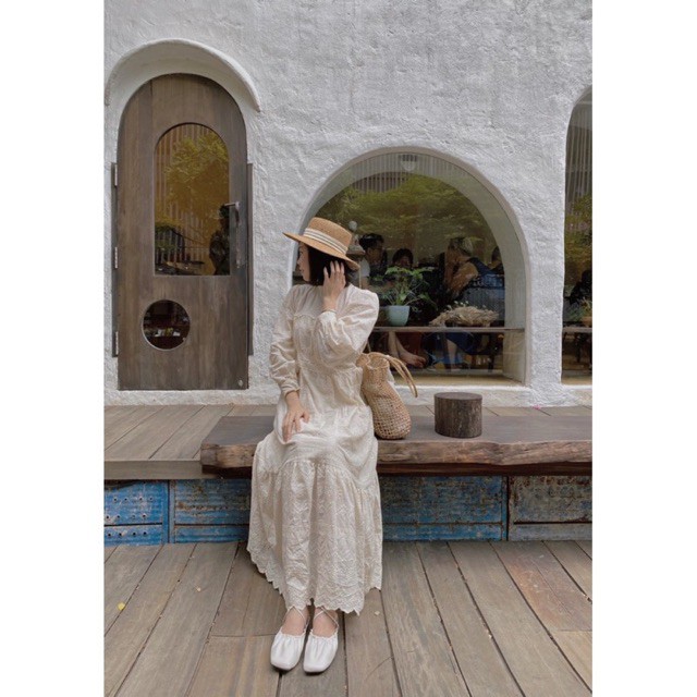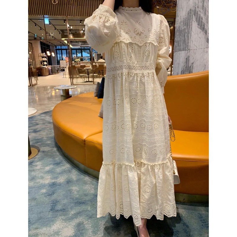 [HÀNG CÓ SẴN]ĐẦM THÊU REN ĐỤC LỖ HOA CAO CẤP DÁNG DÀI TAY PHỒNG CÔNG CHÚA