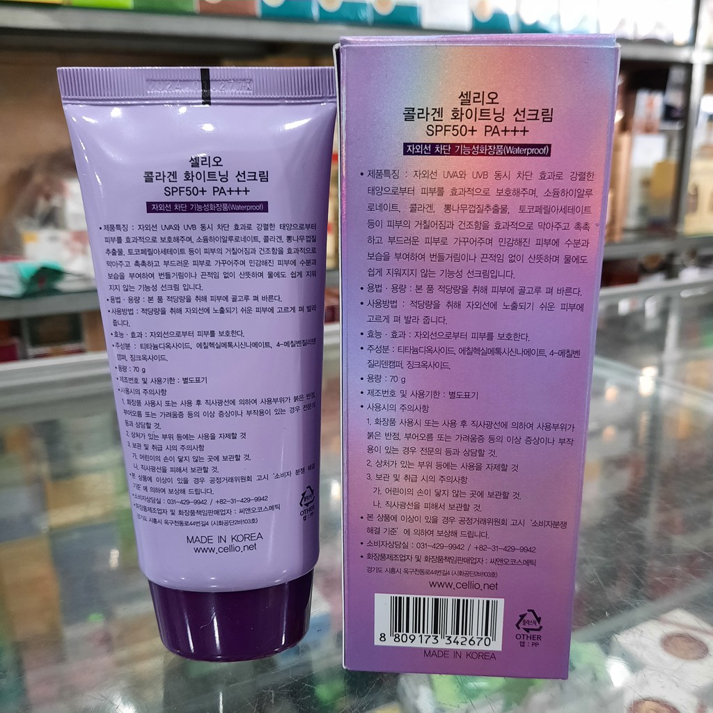 Kem chống nắng Cellio Collagen Whitening Sun Cream SPF50+ PA+++ Hàn Quốc 70ml (Tím)