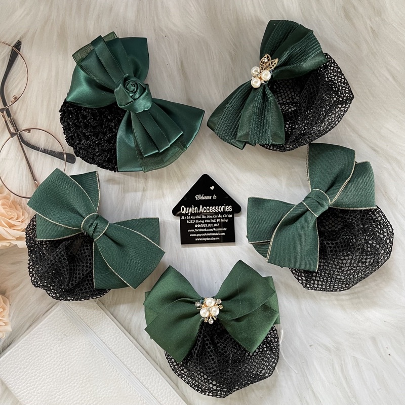 Kẹp búi công sở xanh rêu đính hoa Hồng/ kẹp lưới văn phòng.