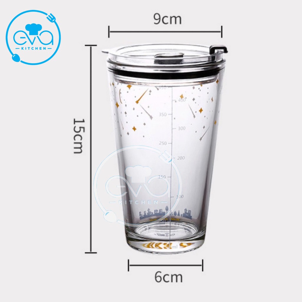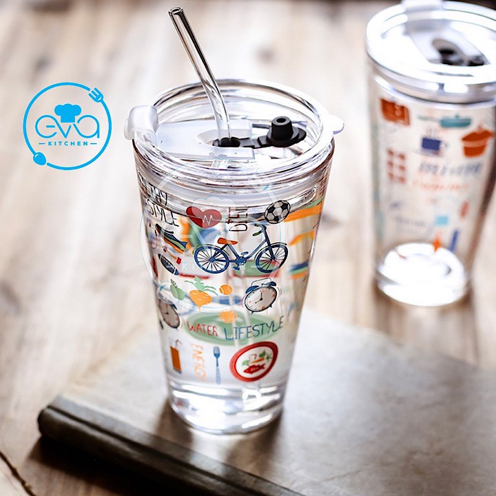 Ly Thuỷ Tinh Chia Vạch Hoạ Tiết Hoạt Hình Có Nắp Đậy Kín Hơi 400 Ml Tặng Kèm Ống Hút Thuỷ Tinh An Toàn