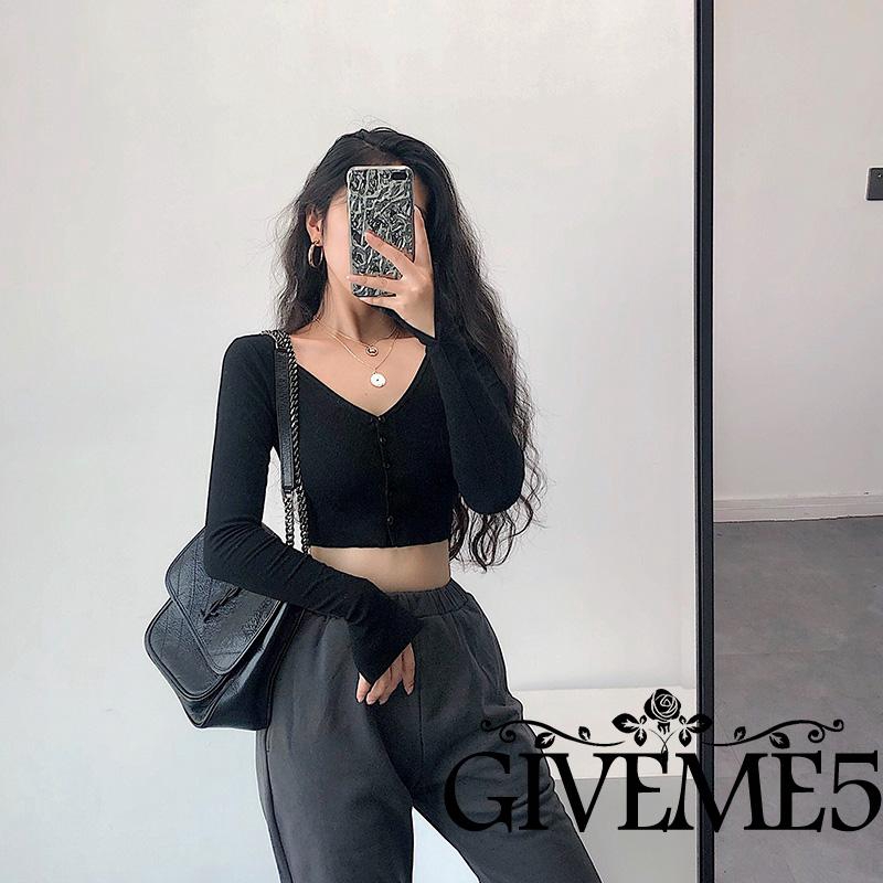 Áo croptop dệt kim tay dài cổ chữ V thời trang cho nữ