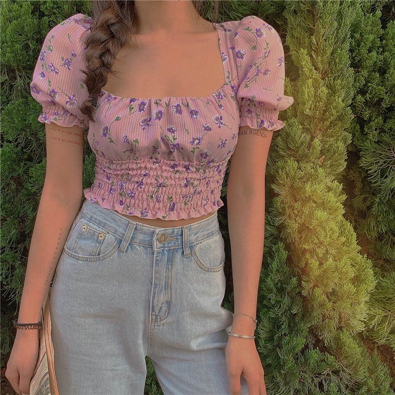 Áo Kiểu Dáng Ôm Cổ Vuông Họa Tiết Hoa Xinh Xắn Dễ Thương Thời Trang Hàn Quốc