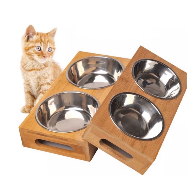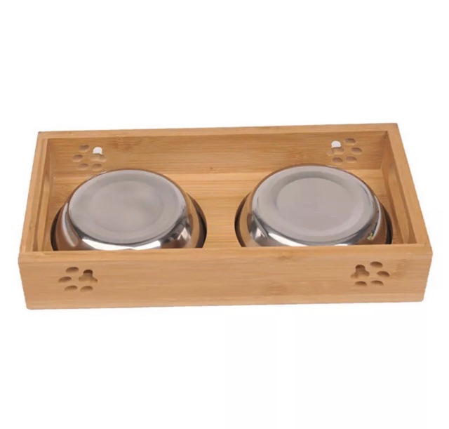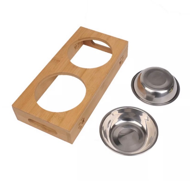 Khay Ăn Gỗ Cao Cấp Cho Chó Mèo 2 Chén Rời Inox