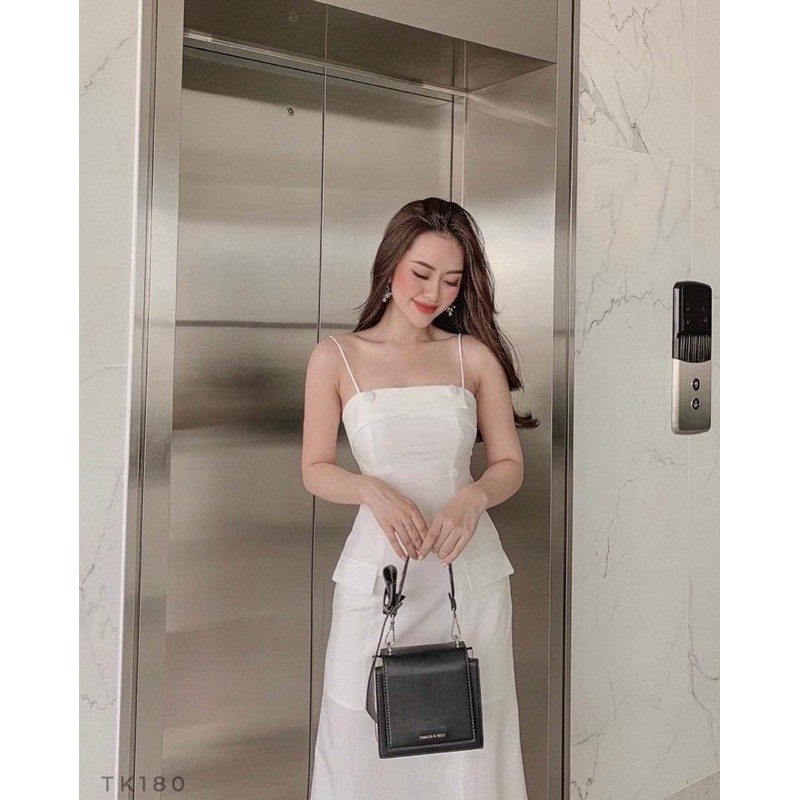 Đầm 2 dây xẻ đùi phối nút bọc to