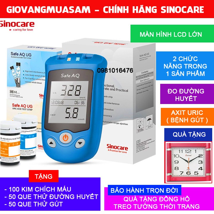 Máy đo đường huyết, Axit Uric Sinocare Safe AQ UG+50 que thử đường,50que Axit Uric DATE DÀI + 100 kim+ Tặng thêm đồng hồ