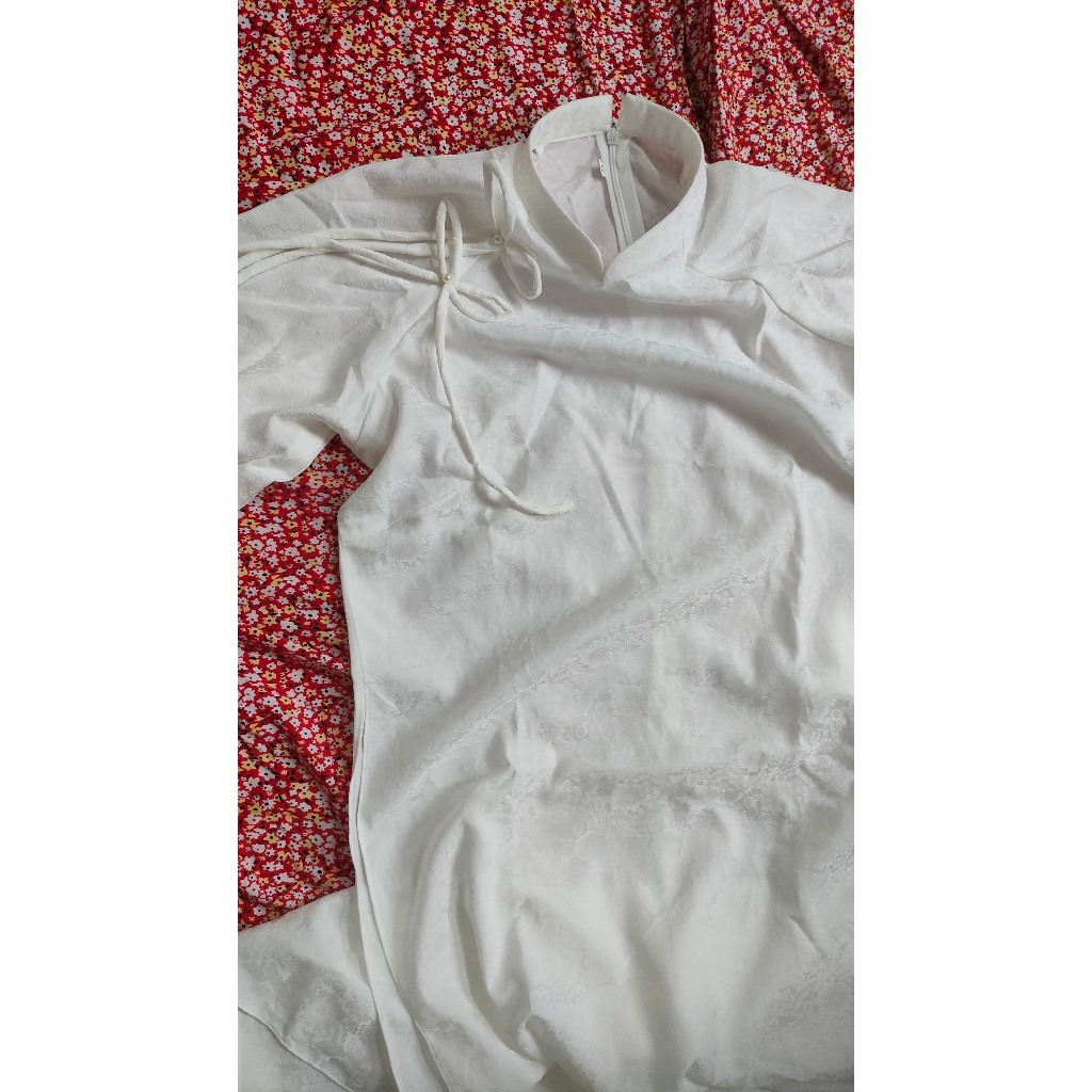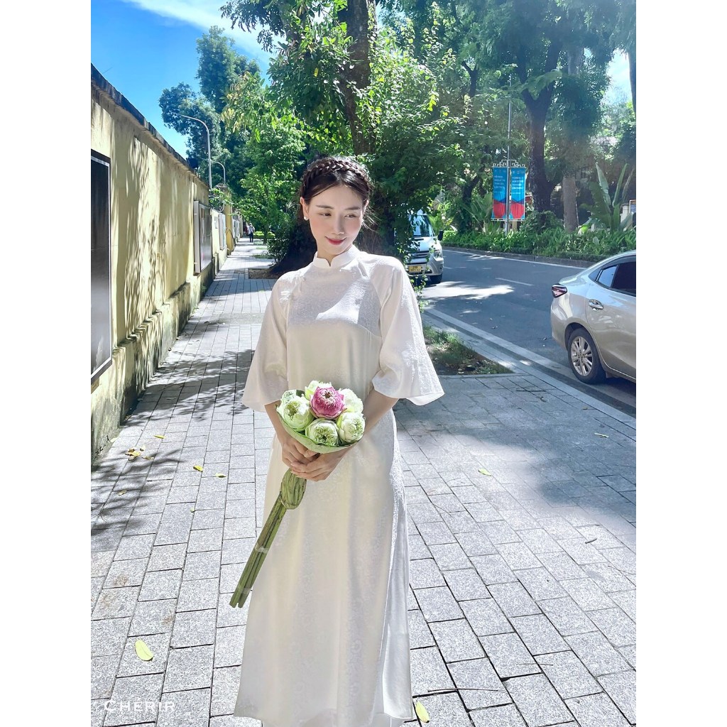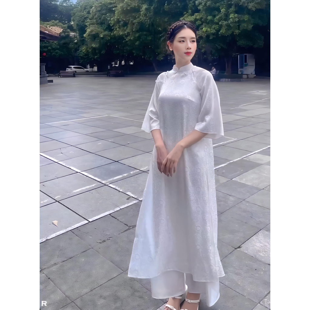 Áo dài thiết kế cách tân tay lửng vải lụa gấm màu Trắng cao cấp, áo dài trơn phi bóng, áo dài lụa thêu hoa