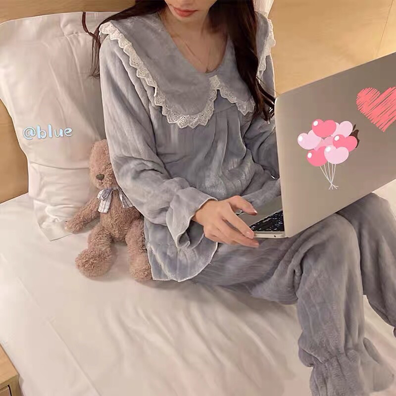 Bộ ngủ lông cổ nơ bánh bèo giữ nhiệt, bộ ngủ tiểu thư chất lông mềm mịn màu hồng dễ thương