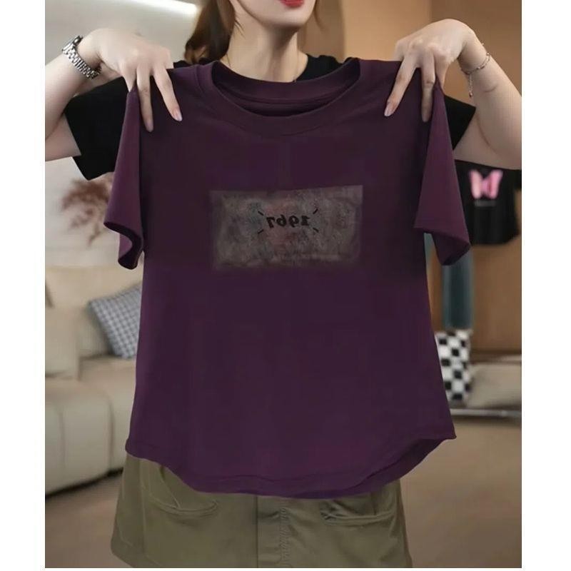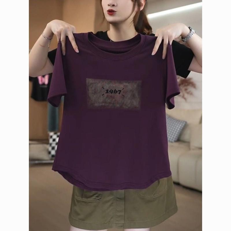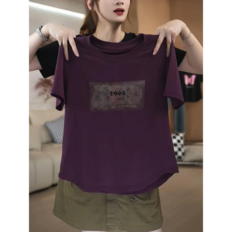 Cotton Nguyên Chất Kích Thước Lớn Phong Cách Hàn Quốc In Màu Tím Áo Thun Nữ Mùa Hè 2025 Phong Cách Mới Rời Mỏng Hơn Nhìn Trang Trọng Shou