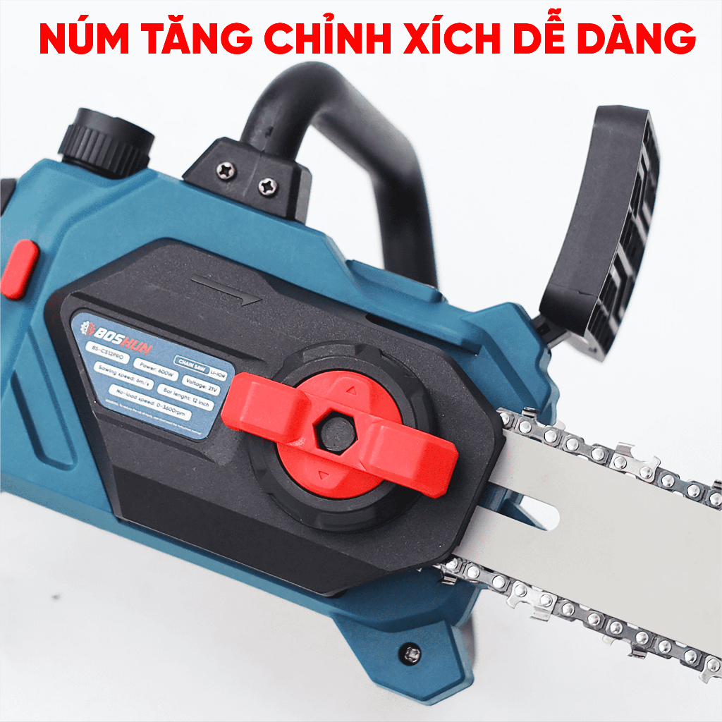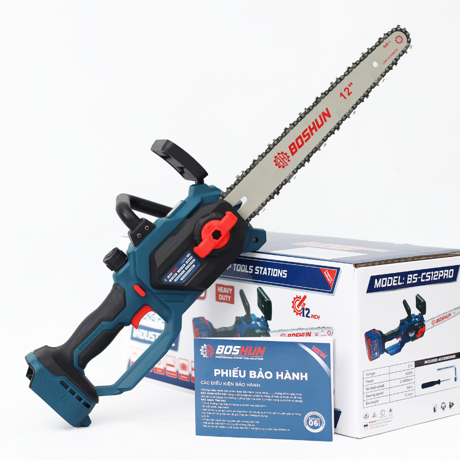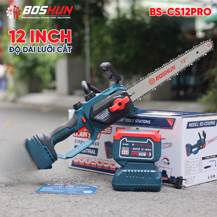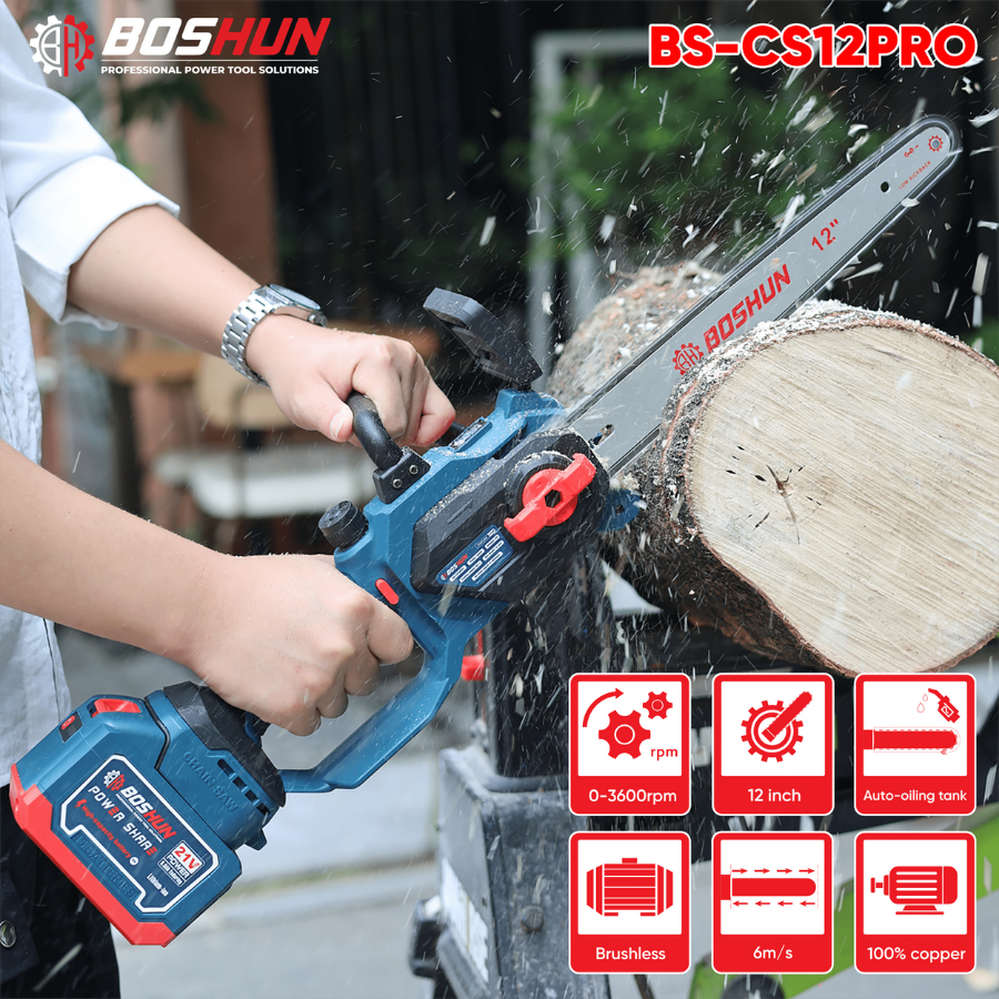 Máy Cưa Xích Chạy Pin Boshun BS-CS12PRO – Động Cơ Không Chổi Than, Lam 12 Inch, Bơm Nhớt Tự Động
